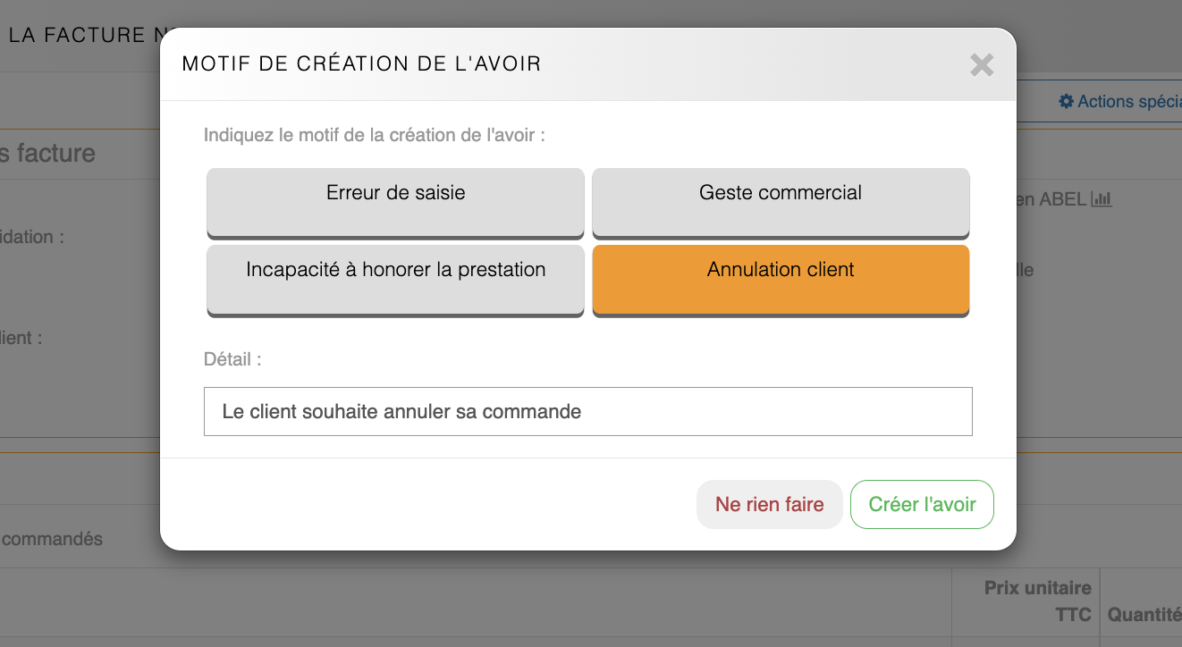 Créer une facture d'avoirAprès avoir cliqué sur « Créer un avoir », un motif de création d'avoir est demandé.