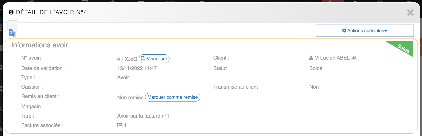 Solde de l'avoir et remboursement du clientAprès avoir validé la facture d'avoir, il ne reste plus qu'à « Solder l'avoir » pour rembourser le client. Il est possible de solder l'avoir sans remboursement si la facture n'avait pas encore été réglée.