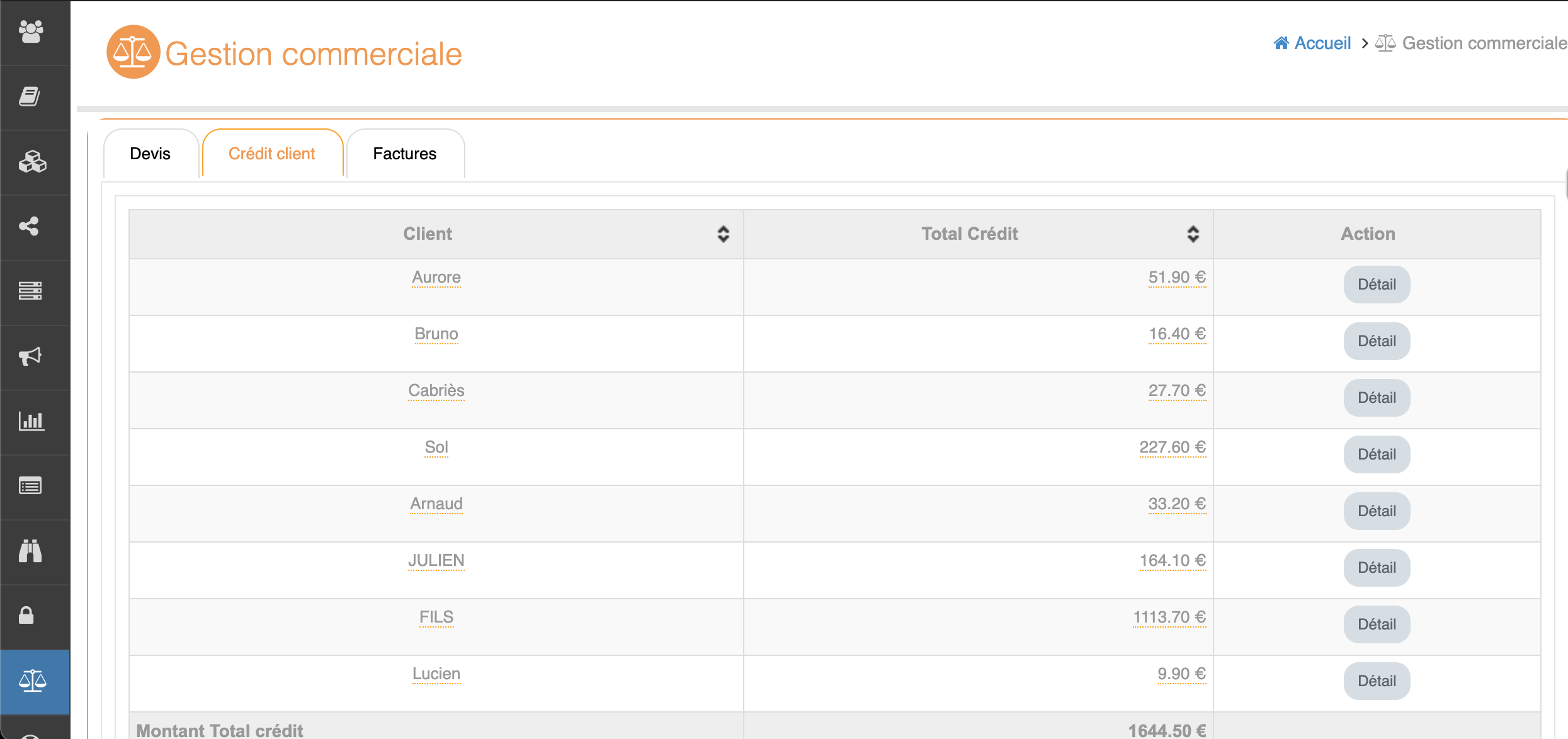 Liste des crédits clientDepuis la gestion commerciale, l'onglet « Crédit client » donne accès à tous les crédits non régularisés. Il suffit de cliquer sur « Détails » pour voir la totalité des créances du client.
