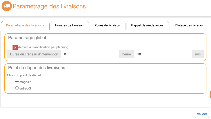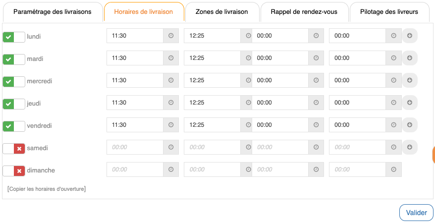 Paramètre des livraisonsL'onglet Paramétrage des livraisons permet de définir un créneau de livraison pour annoncer le temps de livraison pour les commandes.