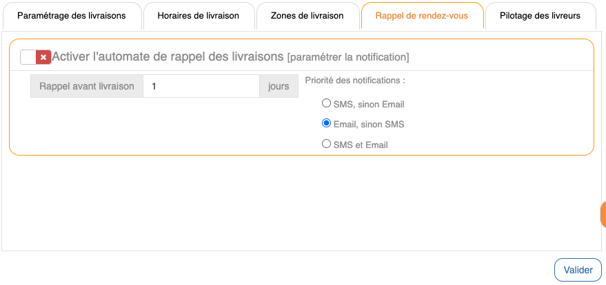 Paramètre Rappel des rendez-vousLe restaurateur va pouvoir configurer des rappels pour les livraisons, mais aussi le canal des notifications.