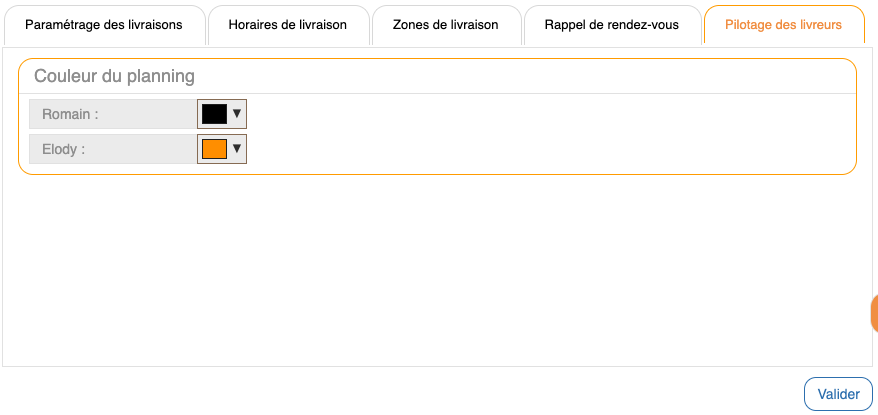 Paramètre Pilotage des livreursLe restaurateur peut choisir une couleur par livreur pour avoir une meilleure visibilité sur son planning.
