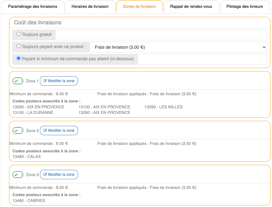La solution permet également de définir des zones de livraisons et des règles pour que les clients ne puissent pas commander hors du périmètre et des horaires prévus.