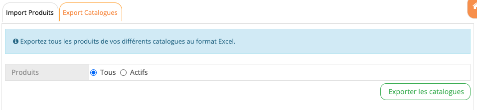 Onglet Export CataloguesIl est possible d'exporter tous les produits du catalogue ou seulement les produits actifs.