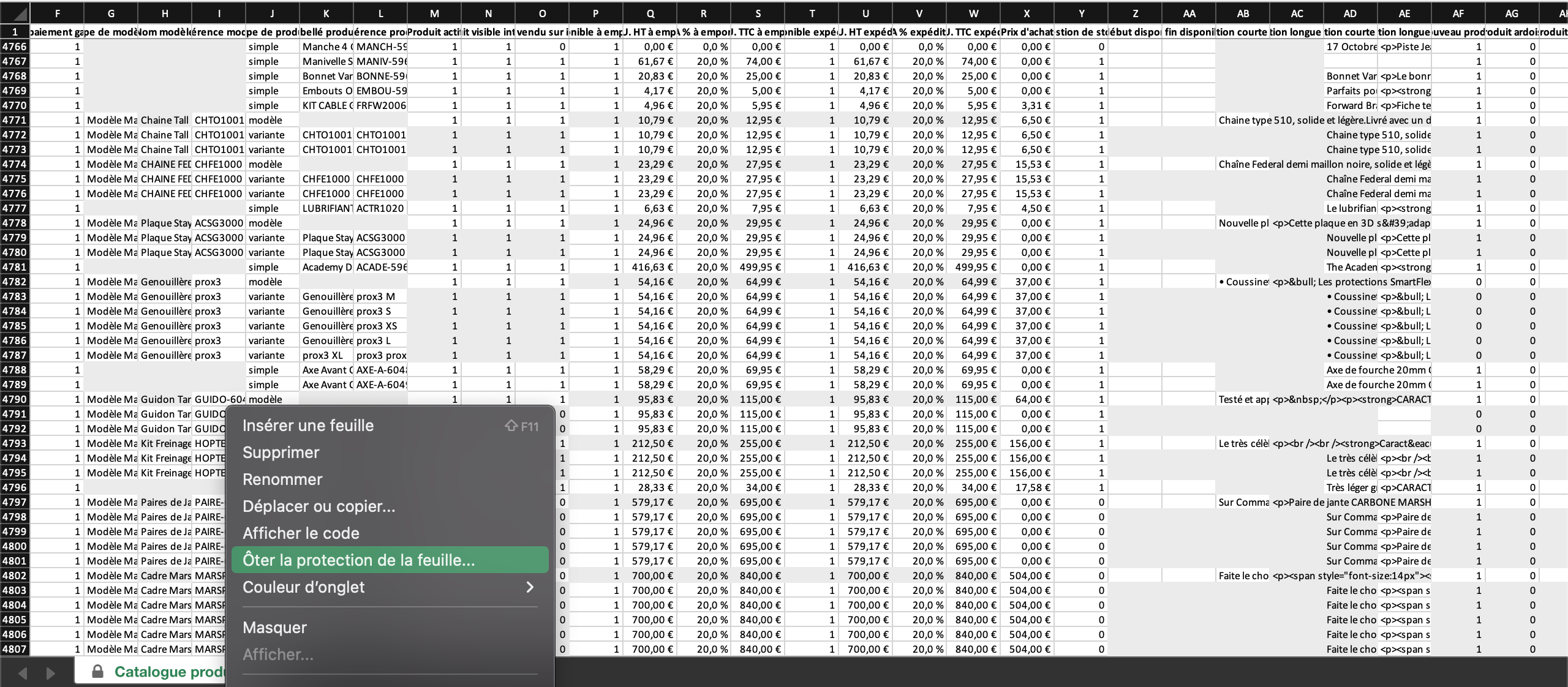 Fichier Excel Catalogue ExportéL'onglet Excel est protégé, il faut penser à ôter la protection pour pouvoir le modifier.