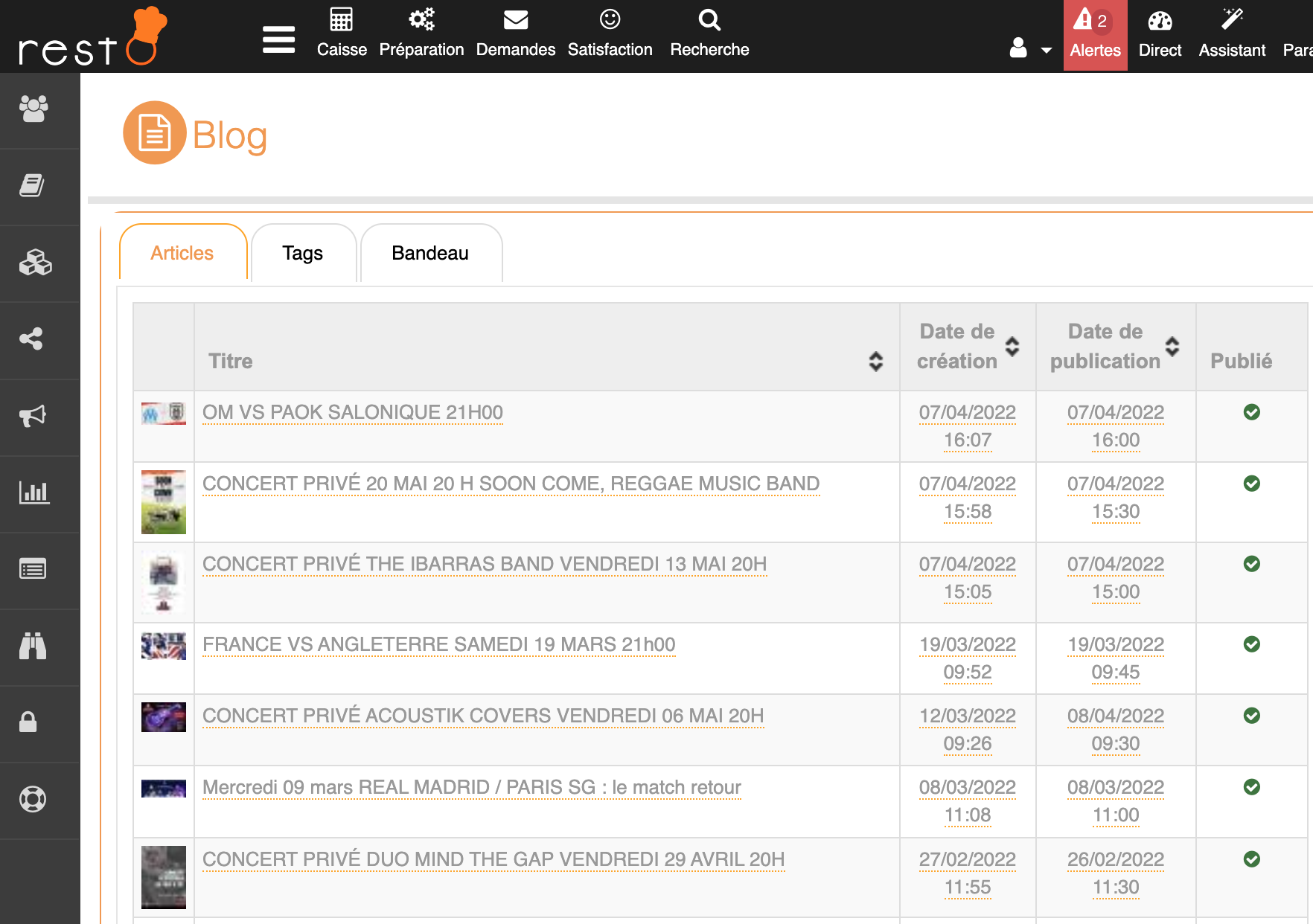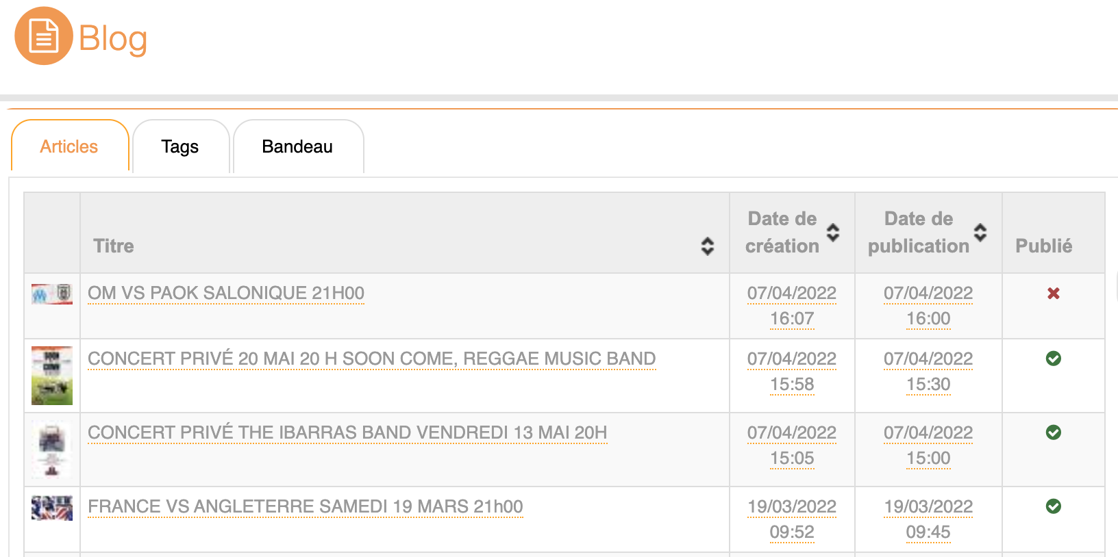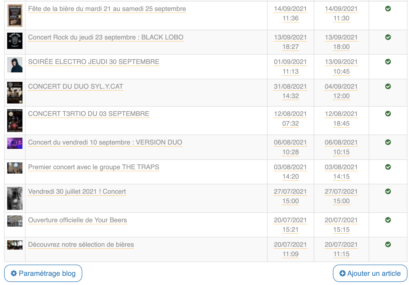 Interface blogDepuis l'interface « Blog », il est possible de modifier un article en cliquant dessus.