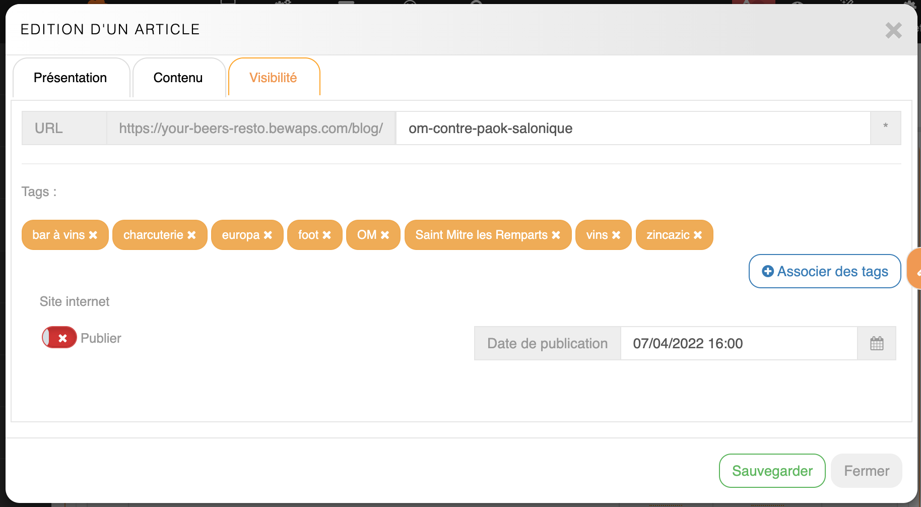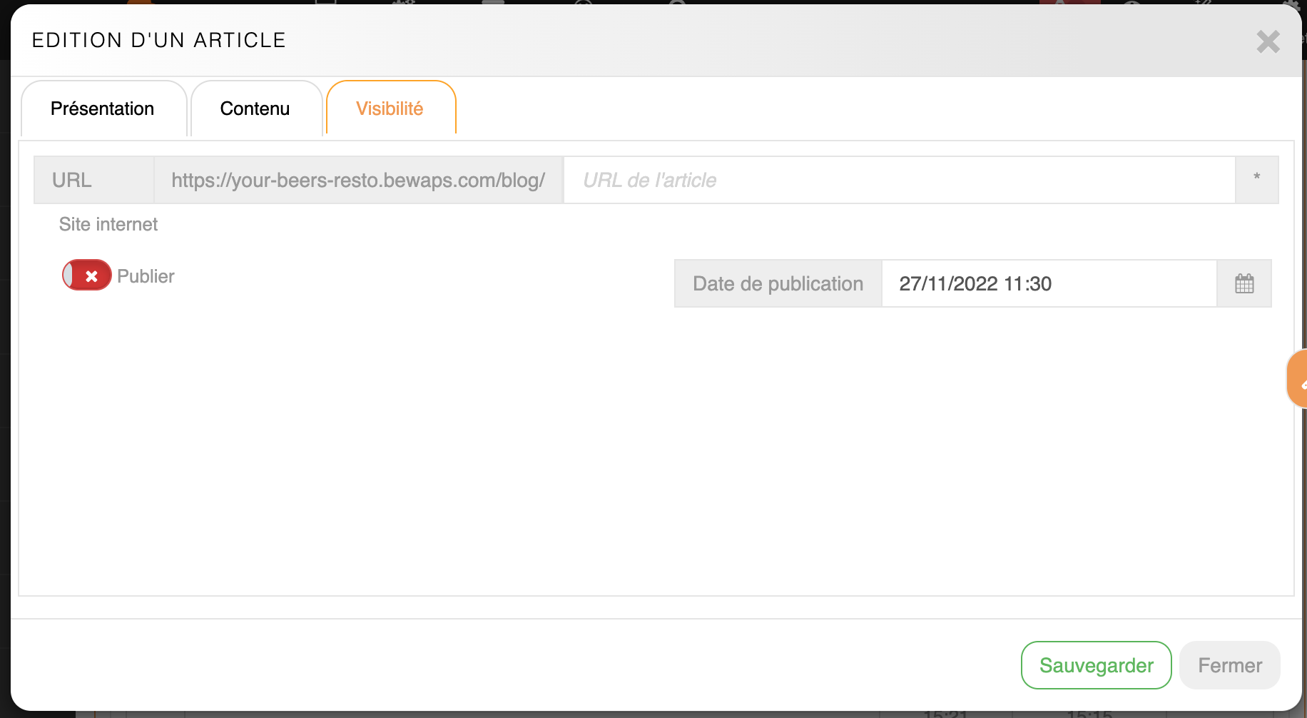 Création d'un article de blog : Onglet VisibleDepuis l'onglet « Visibilité », on retrouve l’URL de l’article ainsi que la date de publication que l’on peut modifier. Après avoir rédigé l’article, avec de belles images et une description qui donne envie, celui-ci peut désormais être publié en cochant « Publier » puis « Sauvegarder ».