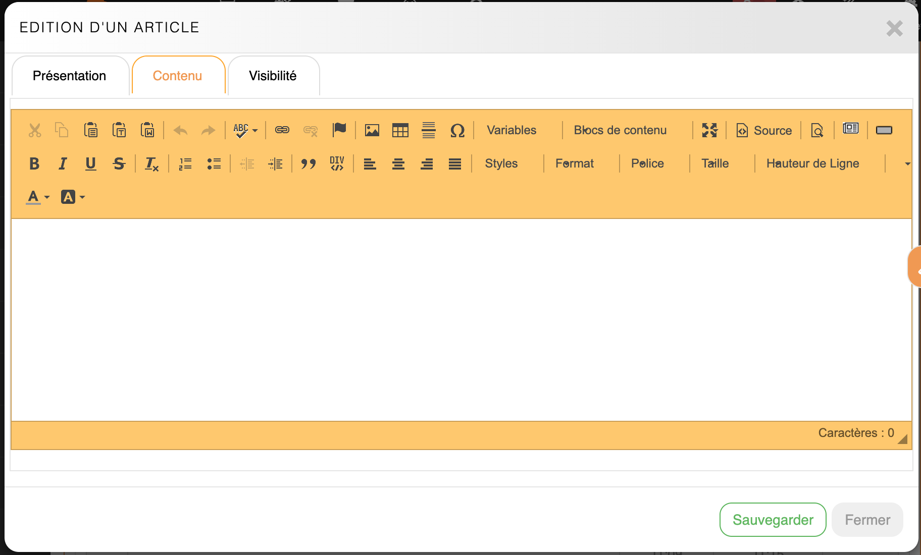 Création d'un article de blog : Onglet PrésentationVoici l’interface de création d’un article de blog, elle se divise en 3 onglets : Présentation, Contenu et Visibilité.