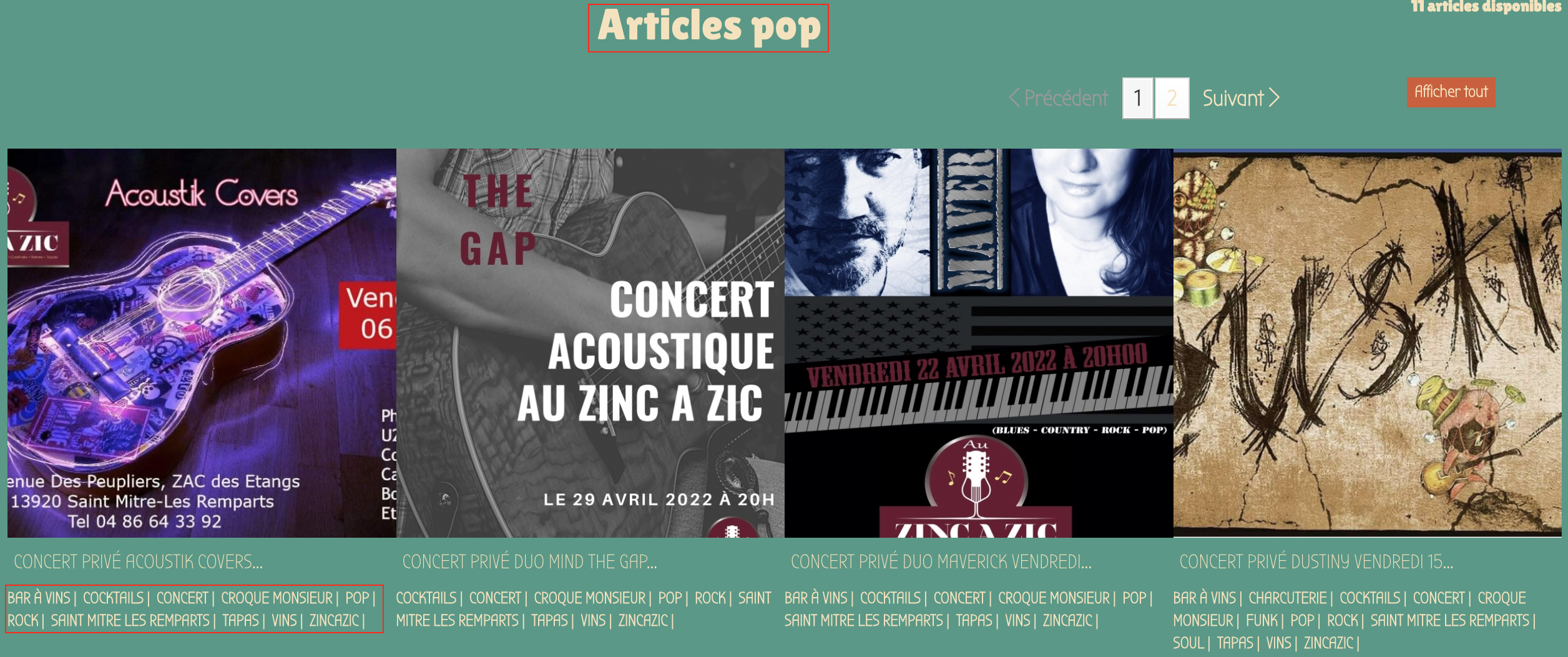 Exemple d'articles associé à la balise "Pop"Les balises apparaissent en bas de l'article. En cliquant sur une balise, le visiteur accède à une page répertoriant tous les articles associés à cette balise.
