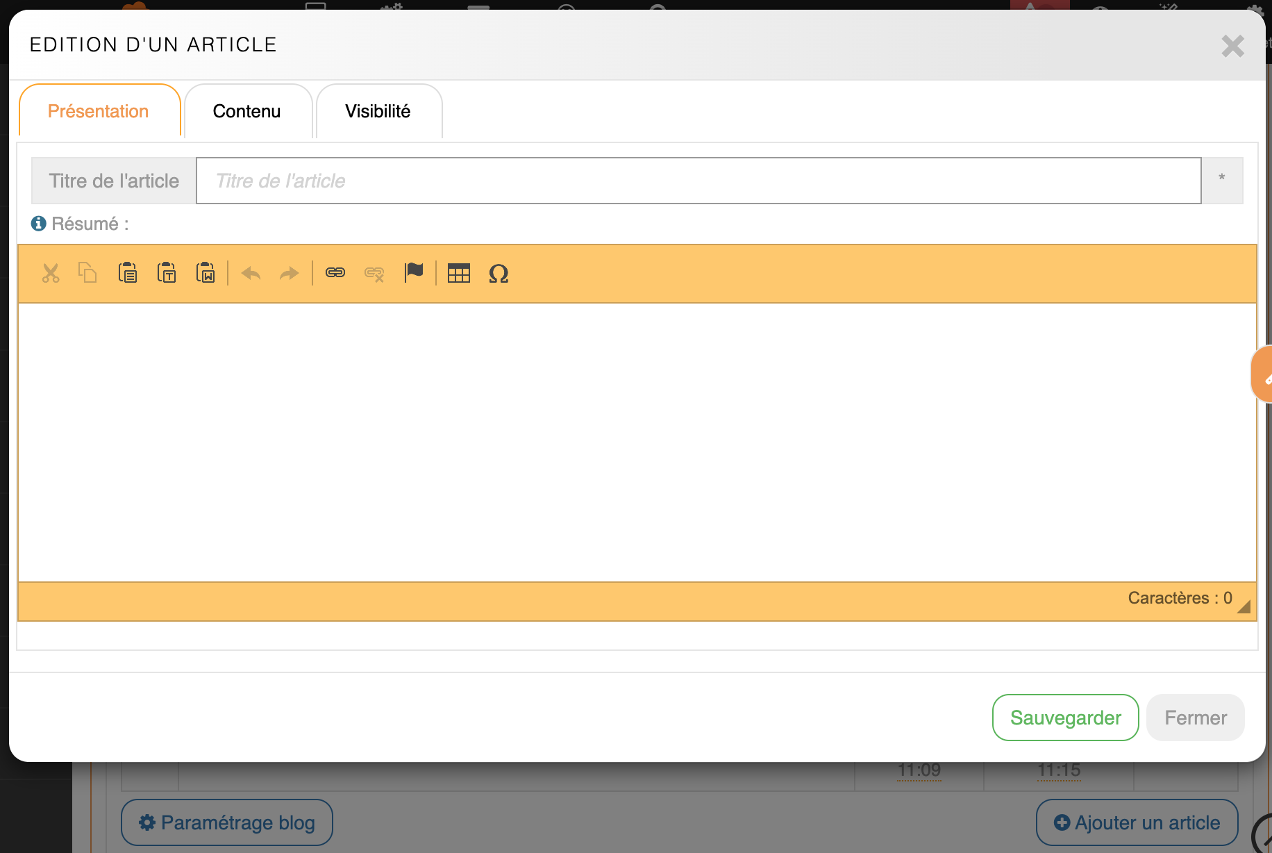 Avant de créer des articles, il faut paramétrer le blog (voir Paramétrage blog).