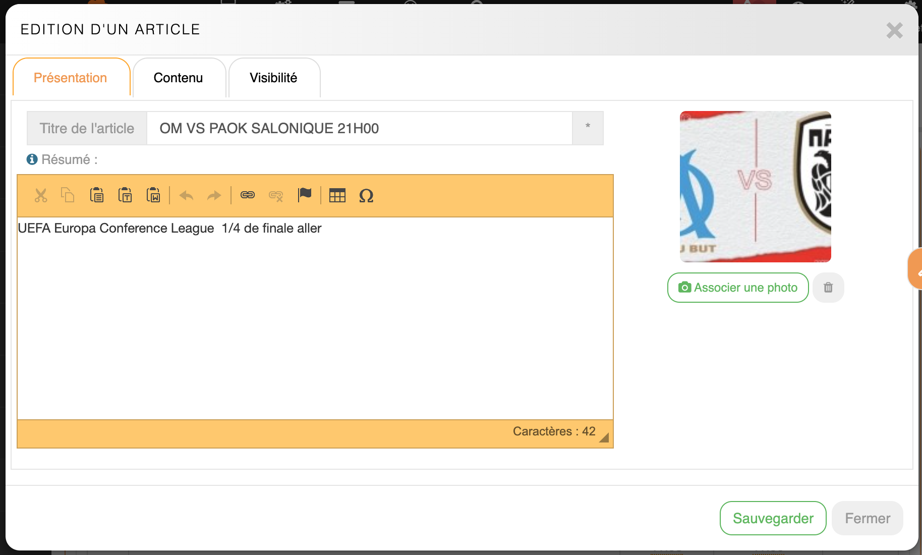 Modification d'un article : Onglet PrésentationDepuis l'onglet « Présentation », il est possible de modifier le titre et le résumer de l'article. Le restaurateur peut également associer une image à l'article qui sera visible depuis la liste des articles sur le site marchand.