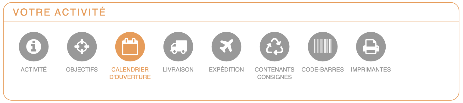 Interface Paramètres - Votre activité - Calendrier d'ouverturePour paramétrer les horaires et le calendrier d’ouverture, cliquer sur « Paramètres », dans le bloc « Votre activité » , cliquer sur « Calendrier d’ouverture ».