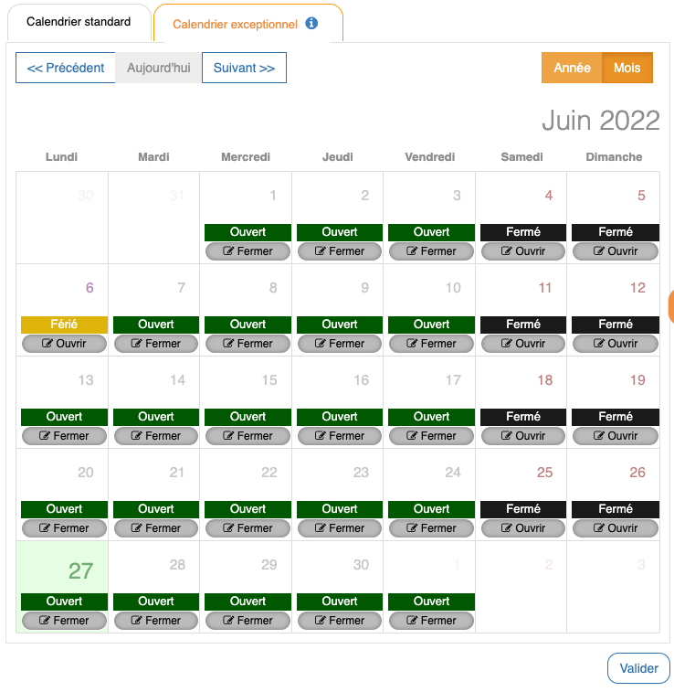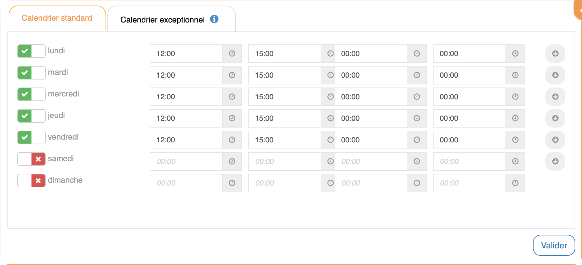 Interface Calendrier StandardLe restaurateur peut facilement modifier les horaires d'ouverture de l’établissement pour chaque jour de la semaine.