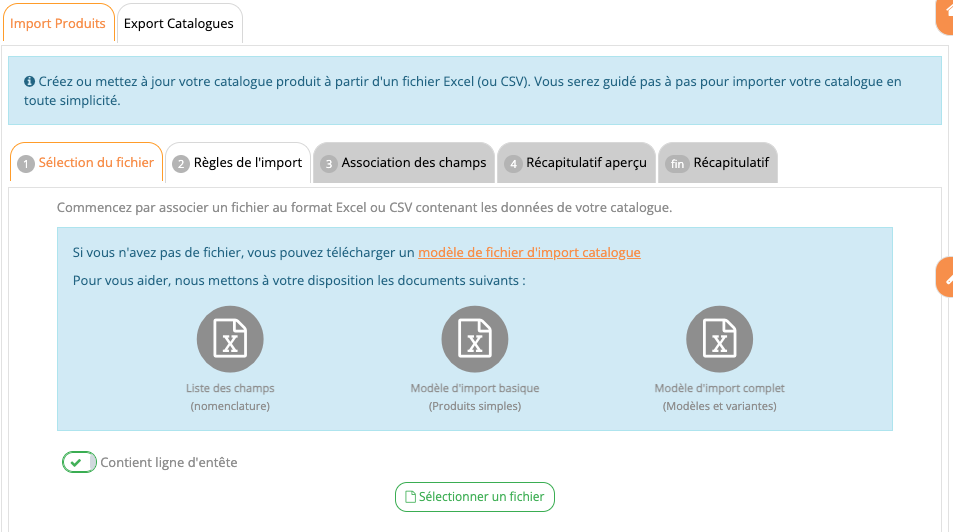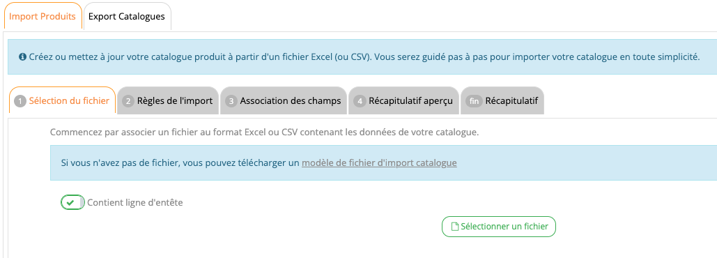 Après avoir pris en compte le récapitulatif d'import, il est possible de faire un nouvel import en appuyant sur l'onglet « Sélection de fichier » puis en choisissant le catalogue Excel modifié et en reprenant les étapes précédentes.