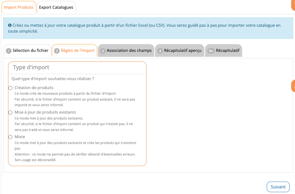 Règles de l'importL'étape « Règles de l'import » permet de définir s'il s'agit d'une création de nouveaux produits ou d'une modification de produits déjà existants.