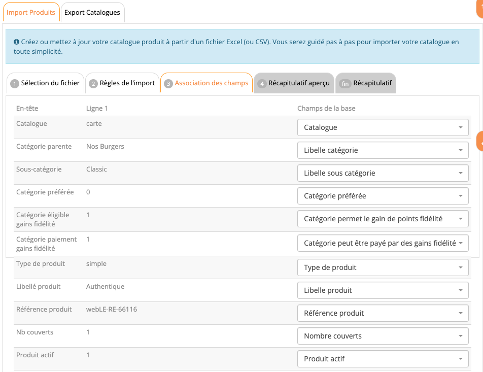 Association des champsL'association des champs permet de faire correspondre les colonnes du fichier Excel et les champs du catalogue. Il est donc important de bien associer chaque ligne à prendre en compte.