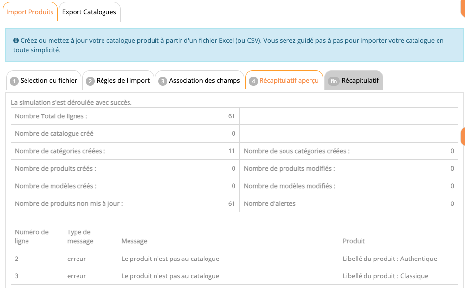 Récapitulatif de l'import catalogueAprès validation, un compte rendu récapitulatif nous informe de l’état de l’import.