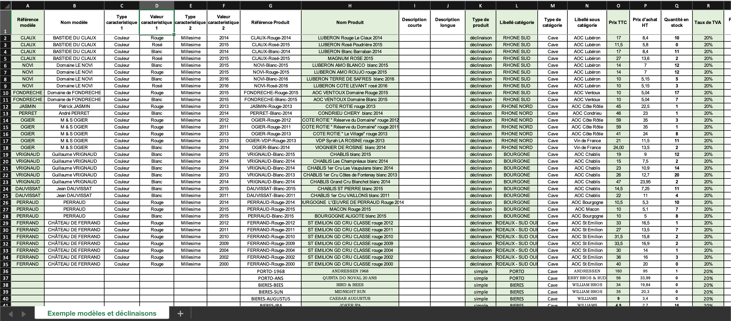 Modèle d'import CompletIl faut remplacer chaque ligne d'exemple pour y renseigner vos propres produits. Il est important de bien renseigné le type de produit (Simple ou Variante), les colonnes liées au modèle (Caractéristique, Nom et référence modèle, Type de modèle) ne seront pas prises en compte s'il s'agit d'un produit simple.
