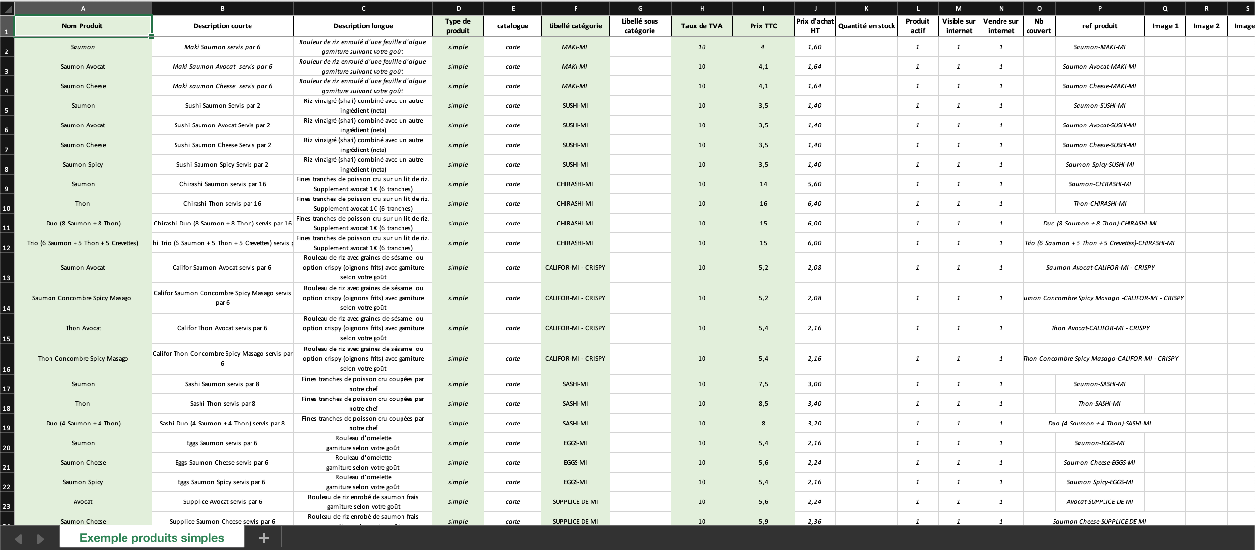 Il faut remplacer chaque ligne d'exemple pour y renseigner vos propres produits simples.