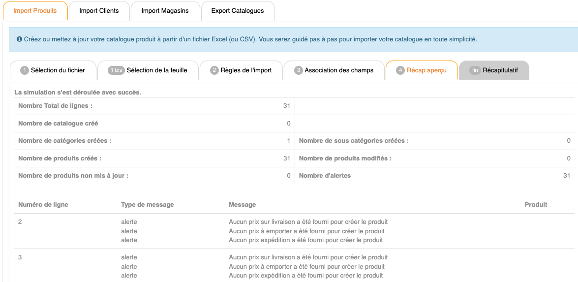 Récapitulation de la simulation d'importCette page nous affiche un récapitulatif, après une simulation d’import, indiquant les potentielles erreurs d’import. L'aperçu de la simulation d'import indique le nombre de produits, catalogue et catégories créés/modifiés ainsi que du nombre d'alertes avec un récapitulatif de celles-ci afin de pouvoir y remédier avant de faire l’import.