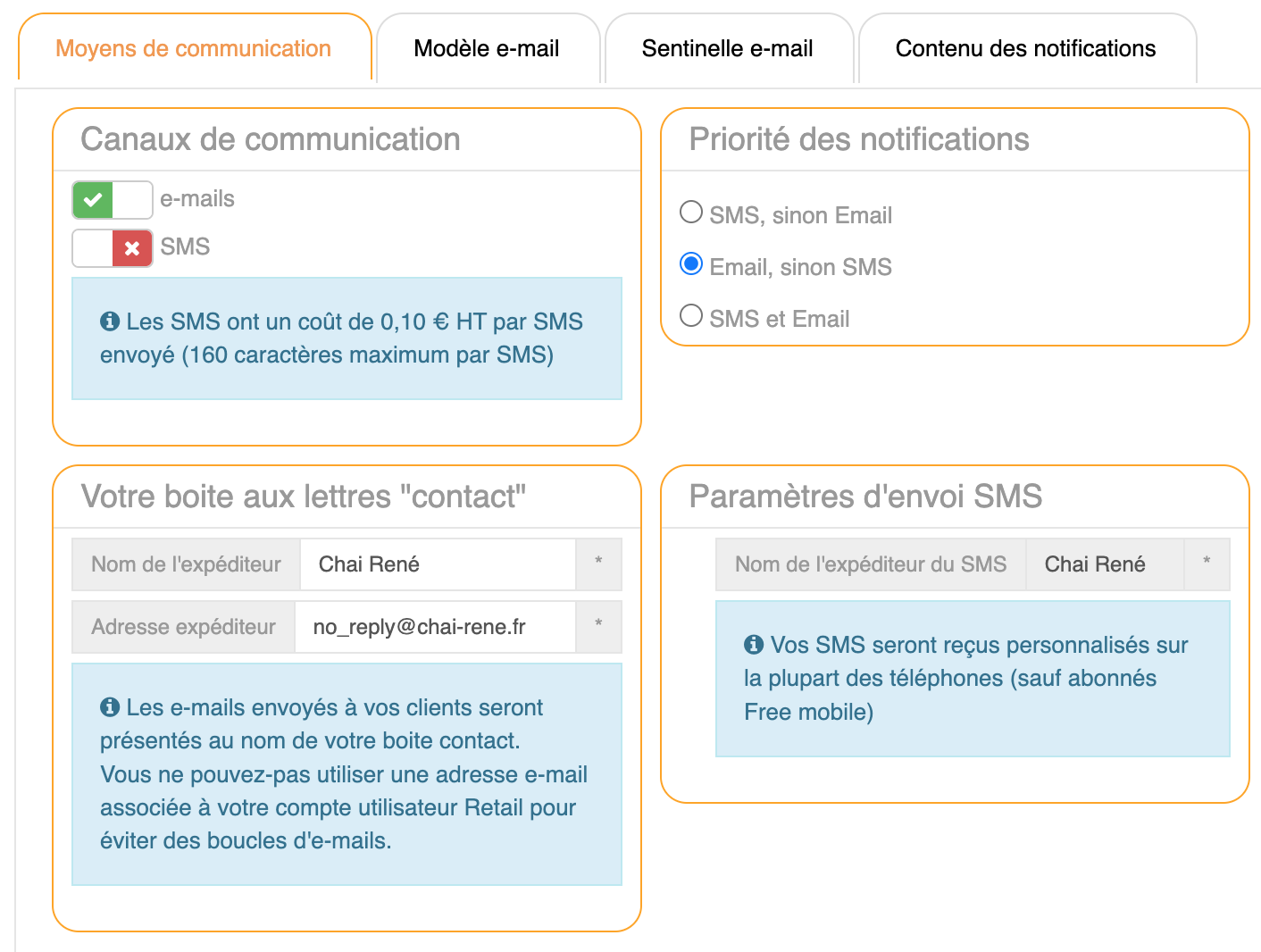 Onglet Moyens de communicationL'onglet « Moyens de communication » permet de paramétrer l'envoi de notifications par mail et SMS.