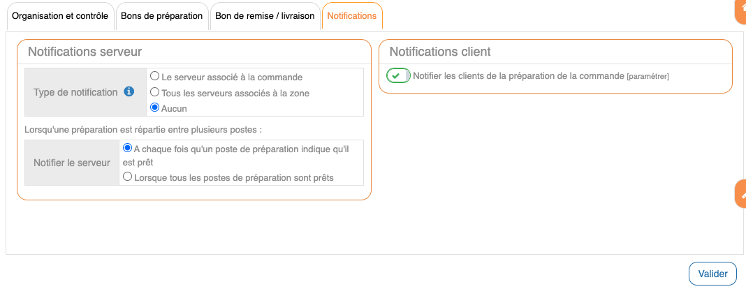 Onglet NotificationsL'onglet «Notifications » permet d'activer les notifications serveurs et les notifications clients. Si les étapes de préparation des commandes sont activées, il est possible d'activer l'envoi de notifications clients lors la préparation des commandes.