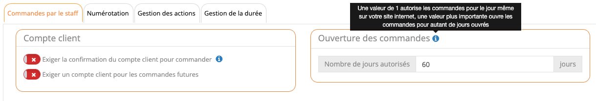 Onglet Commandes par le staff - Ouverture des commandes - Modifier le nombre de jours ouverts à la commande en caisseL'onglet « Commandes par le staff » permet de modifier les paramètres de commande en caisse. Le bloc « Ouverture des commandes » permet de définir le nombre de jours autorisés à la commande.