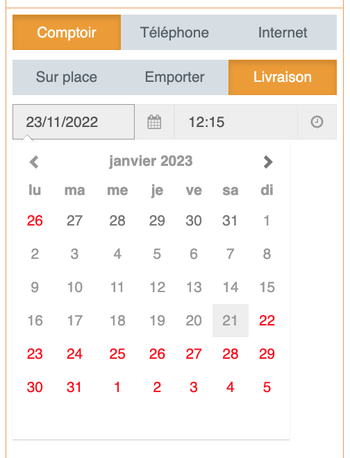S'il s'agit d'une commande sur place ou en expédition, le restaurateur ne pourra pas choisir la date et l'heure de commande.