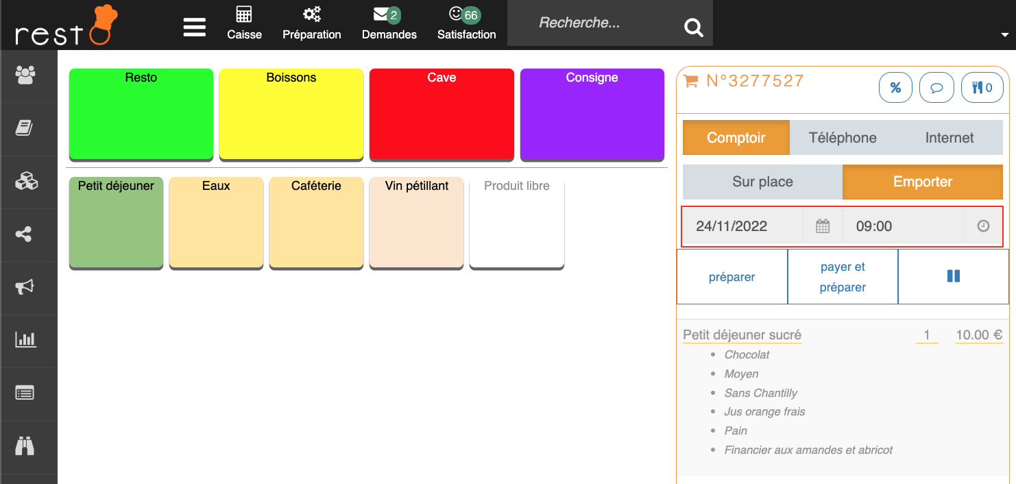 Pour les commandes en livraison ou à emporter, il est possible de définir la date et l'heure de commande souhaitée depuis la caisse.
