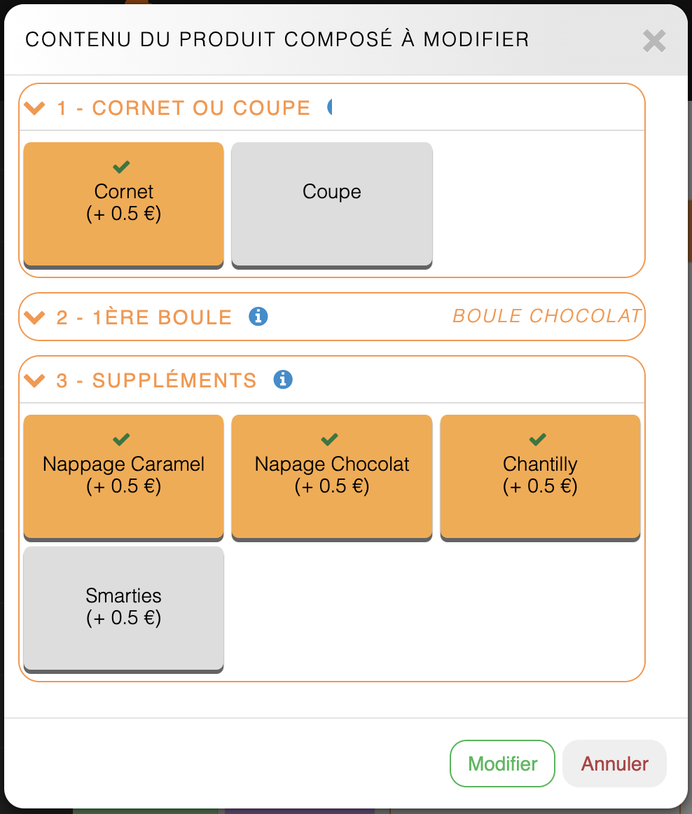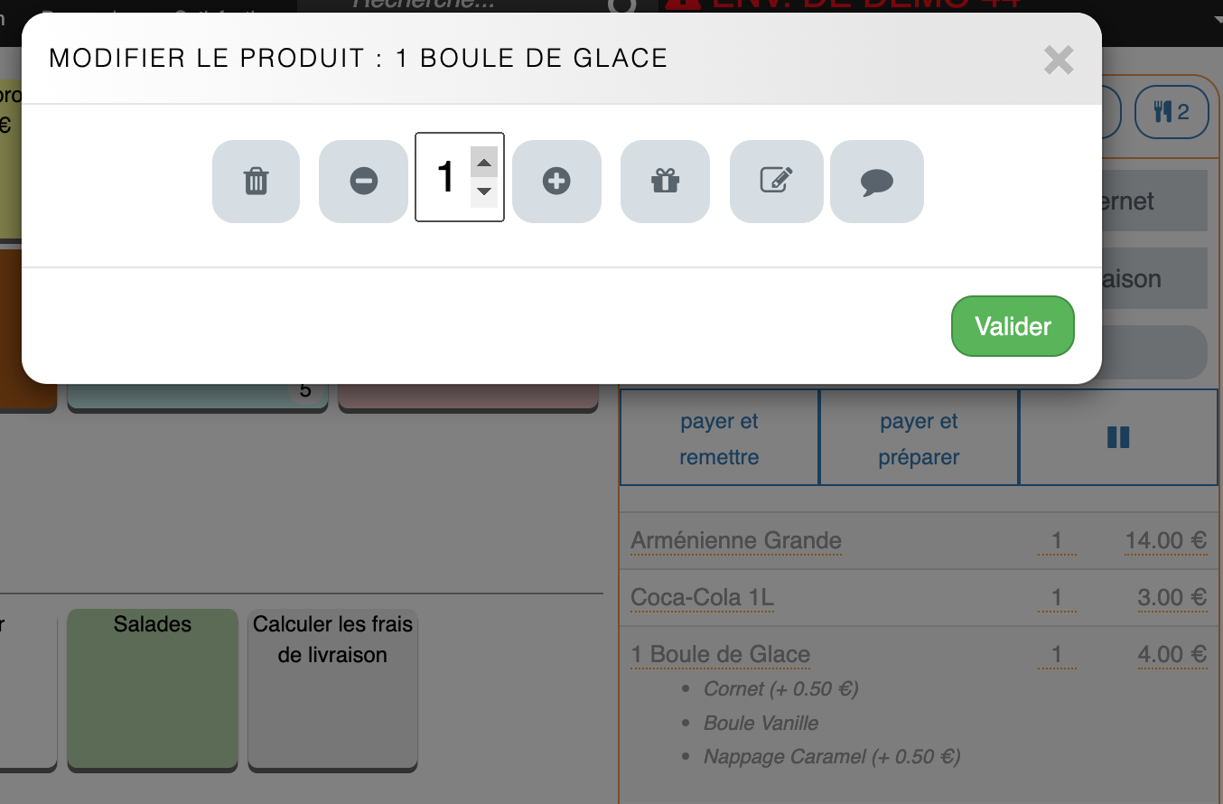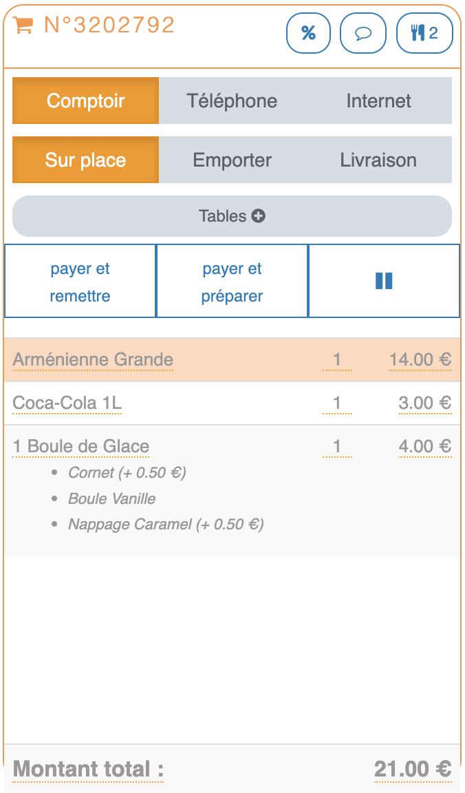 La solution Restô permet de prendre des commandes en caisse très facilement en sélectionnant simplement le produit à ajouter au panier. Interface Caisse Selon le type de produit, il est parfois nécessaire de renseigner la composition du produit. ...