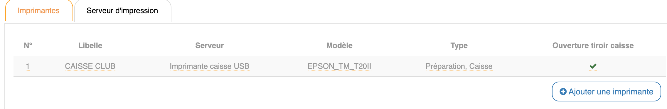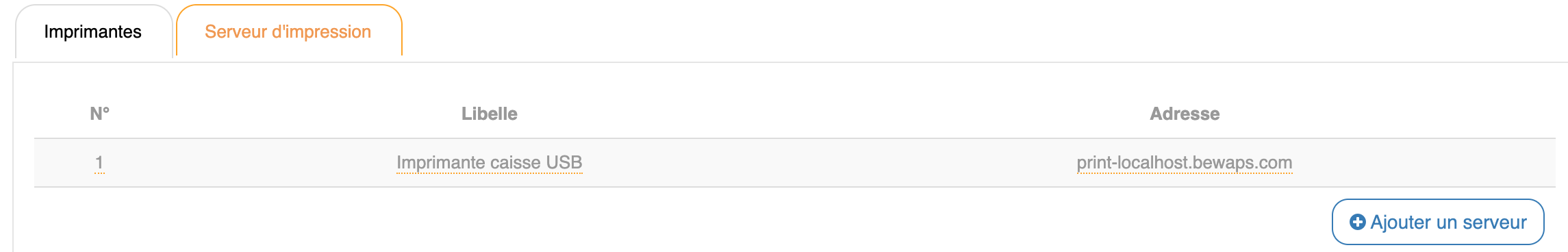 L'onglet Serveur d'impression liste tous vos serveurs d'impression qui permettent de piloter vos imprimantes lorsque qu'elle ne sont pas reliées à la caisse.