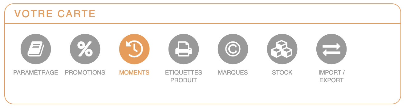 Restô permet de proposer certains produits uniquement certains jours de la semaine ou durant un créneau horaire bien défini (le midi ou le soir par exemple) grâce à la gestion des moments. Sur la caisse, le produit ne sera visible seulement durant le ...