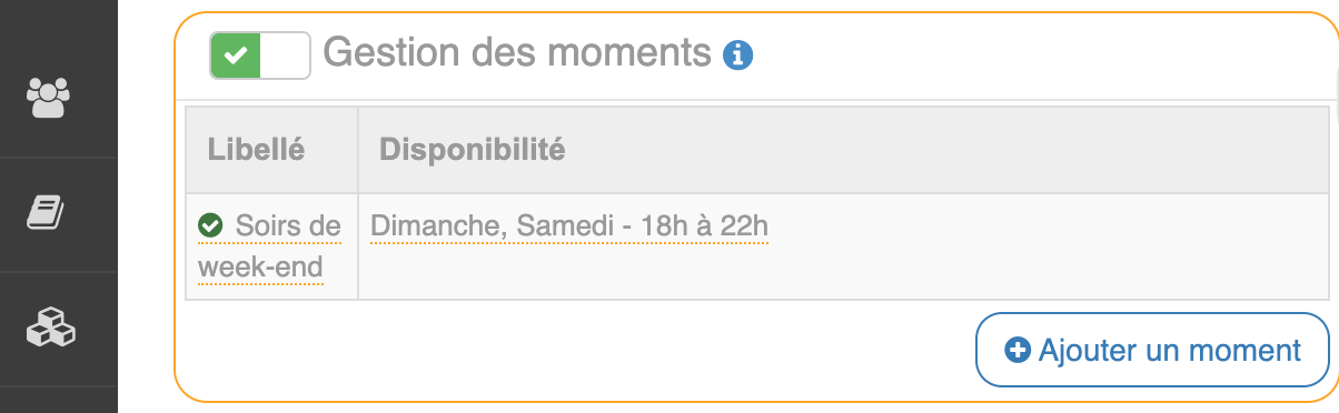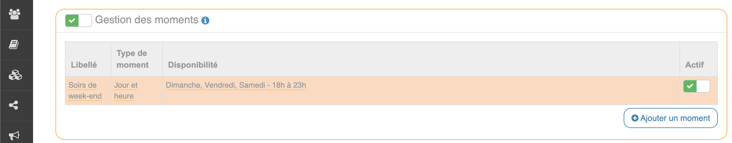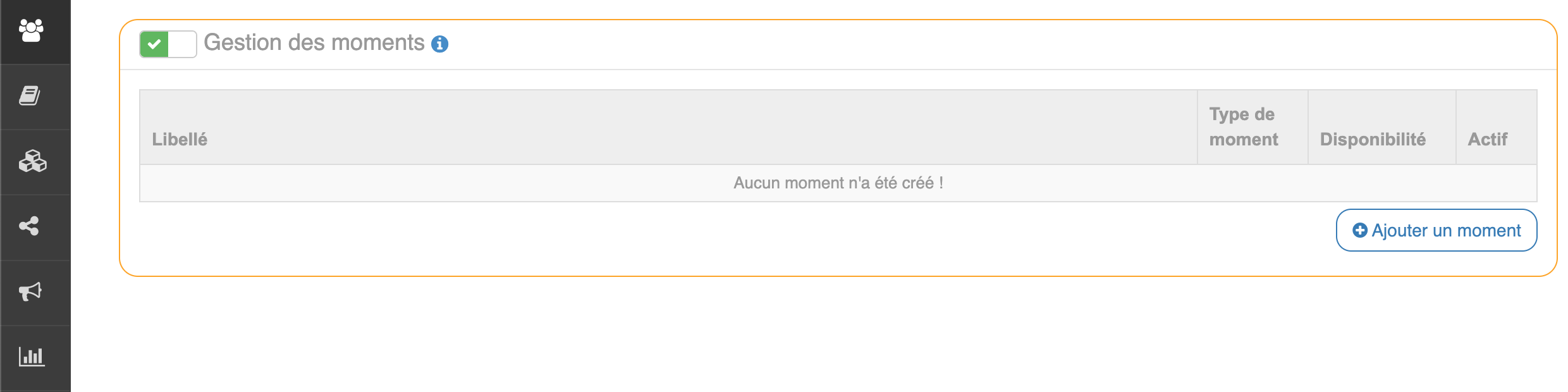Interface Paramètres - Votre carte - MomentsEnsuite, il faut activer la gestion des moments et appuyer sur le bouton Ajouter un moment.