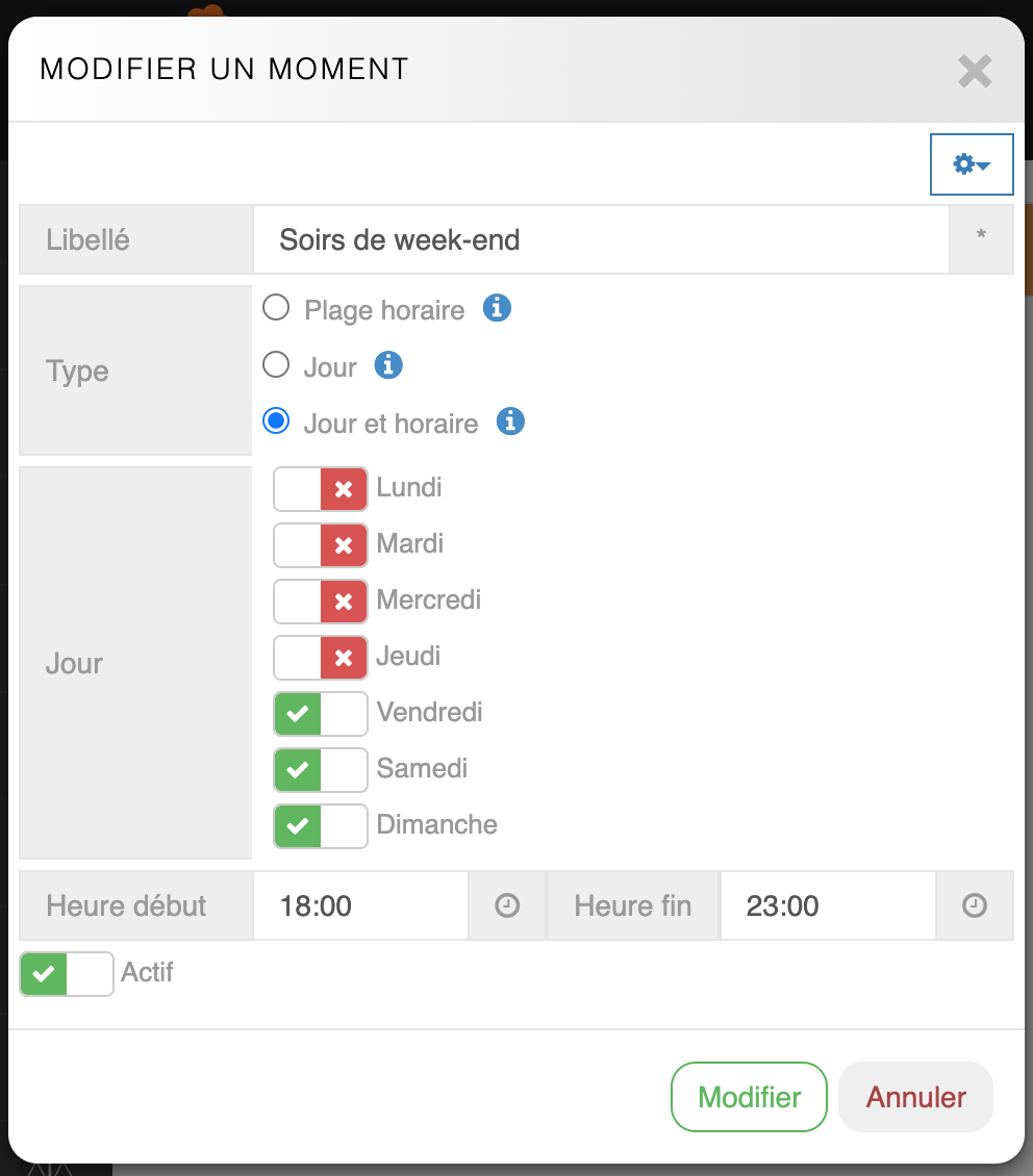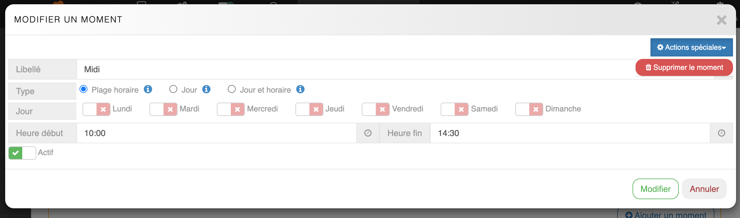 Il est possible de rendre inactif un moment en décochant la case actif.
