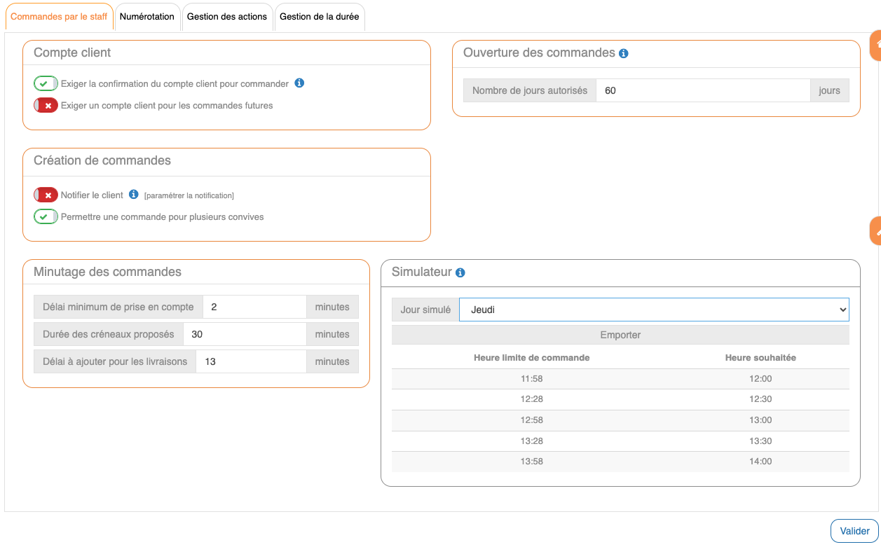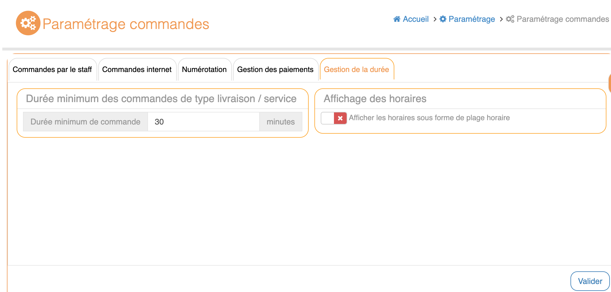 La durée des créneaux proposés est définie dans la partie Minutage des commandes.