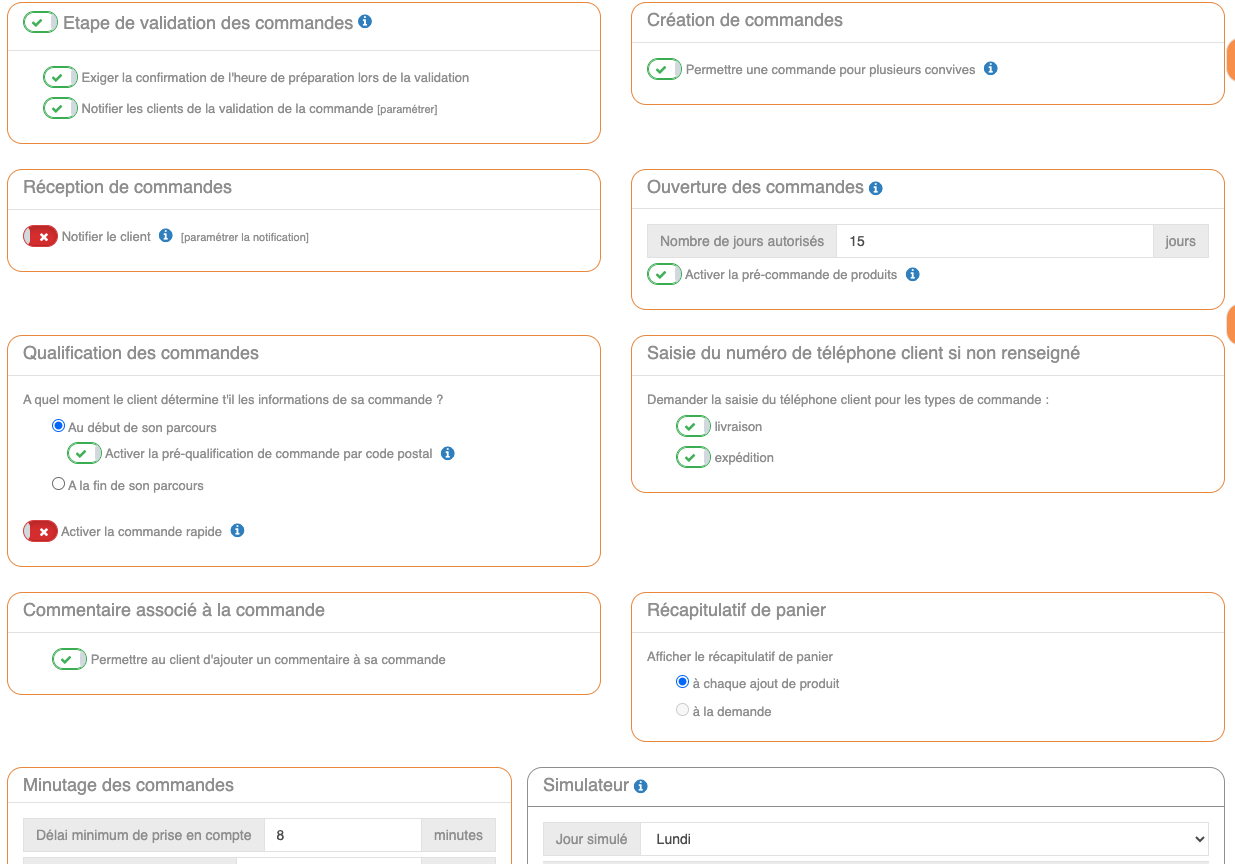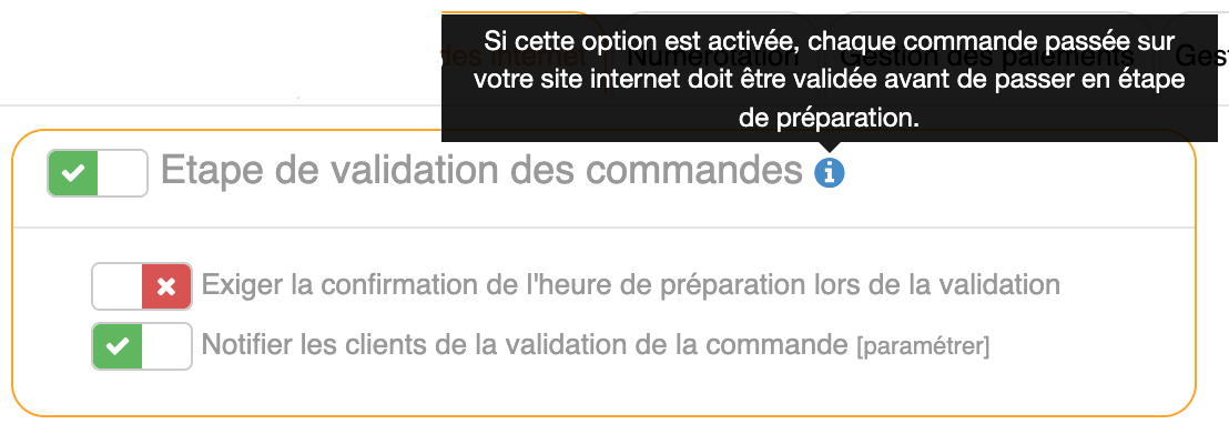 Bloc Étapes de validations des commandesLorsque cette étape est activée, le restaurateur peut exiger la validation de l'heure de préparation lors de la validation. Il est aussi possible d'activer l'envoi de notifications au client lors de la validation de la commande, par mail ou SMS selon les paramètres de notifications (voir