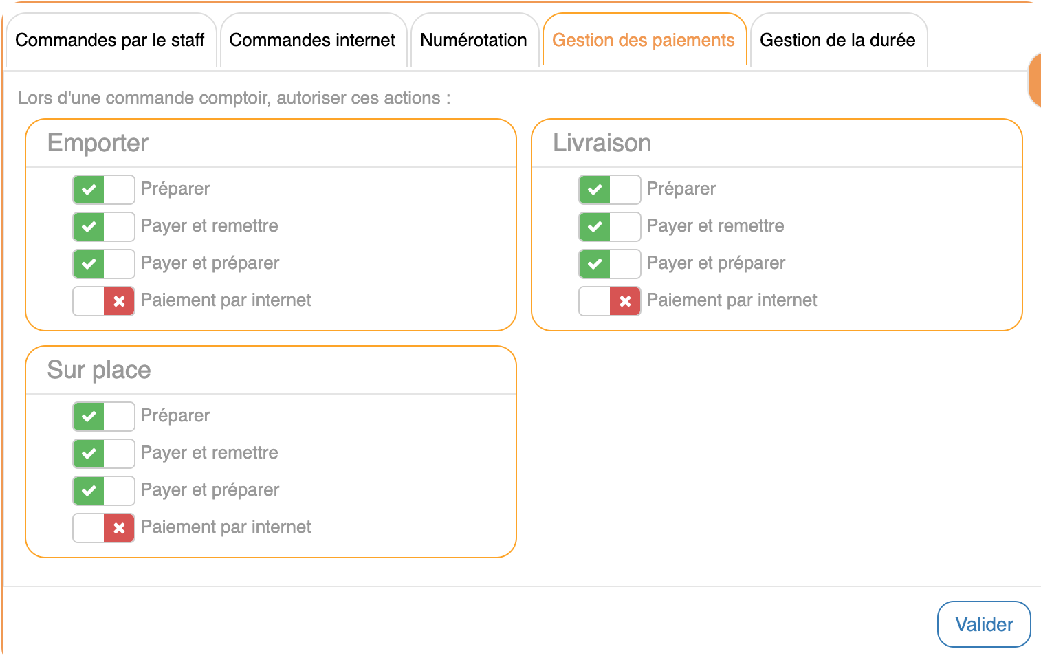 Depuis l'onglet Gestion des paiements, le restaurateur peut personnaliser les actions possibles en caisse, pour chaque type de commande.