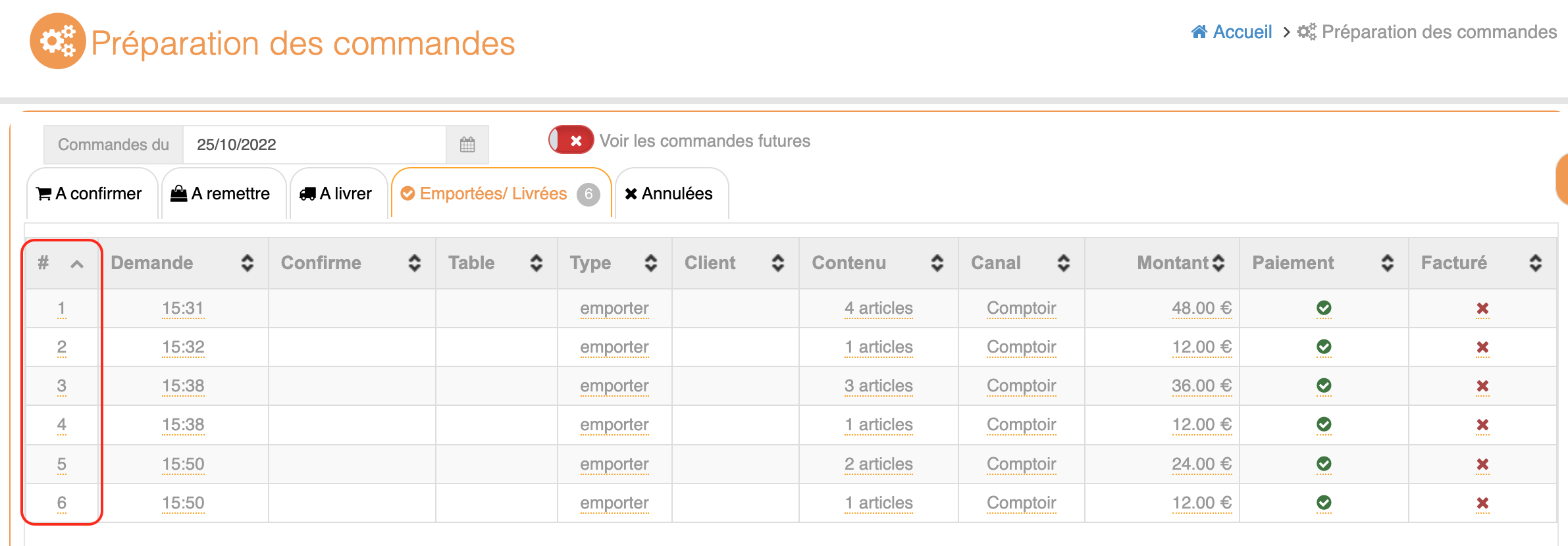 Si cette option est désactivée, la numérotation des commandes ne sera pas visible dans le tableau des préparations.