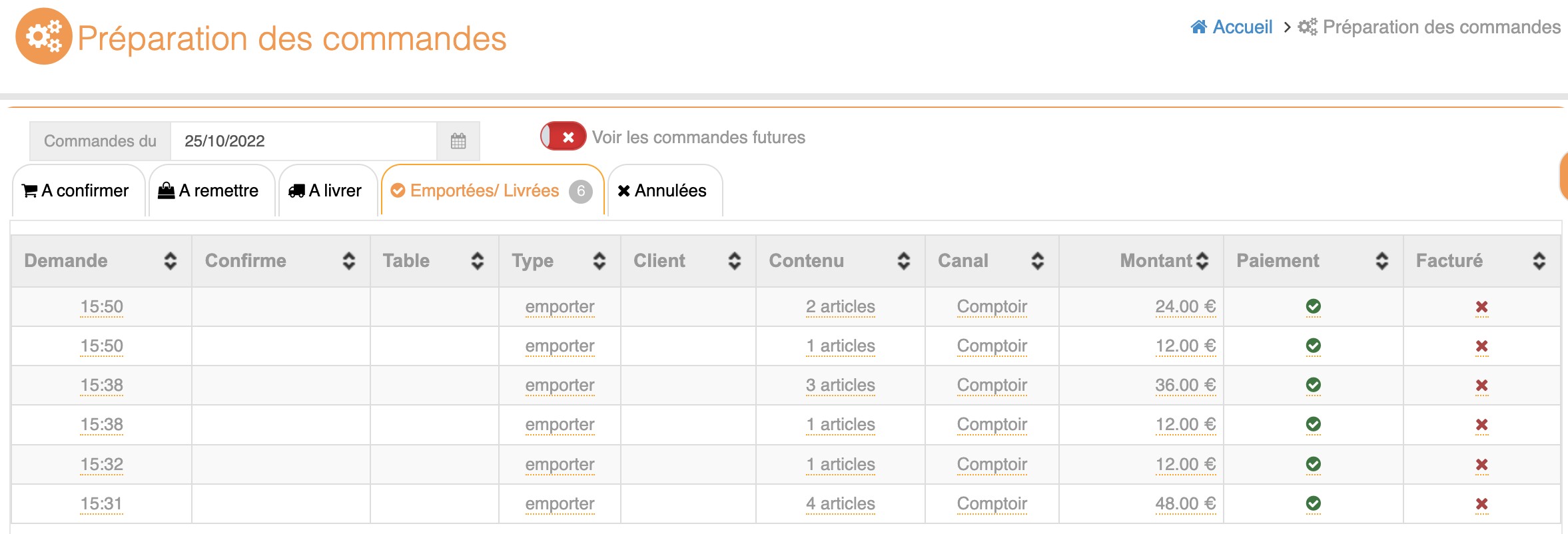 L'action Payer et préparer sert à encaisser le client et à envoyer la commande en préparation. Une fois la commande remise, il faudra penser à la passer au statut Emportée/Livrée.