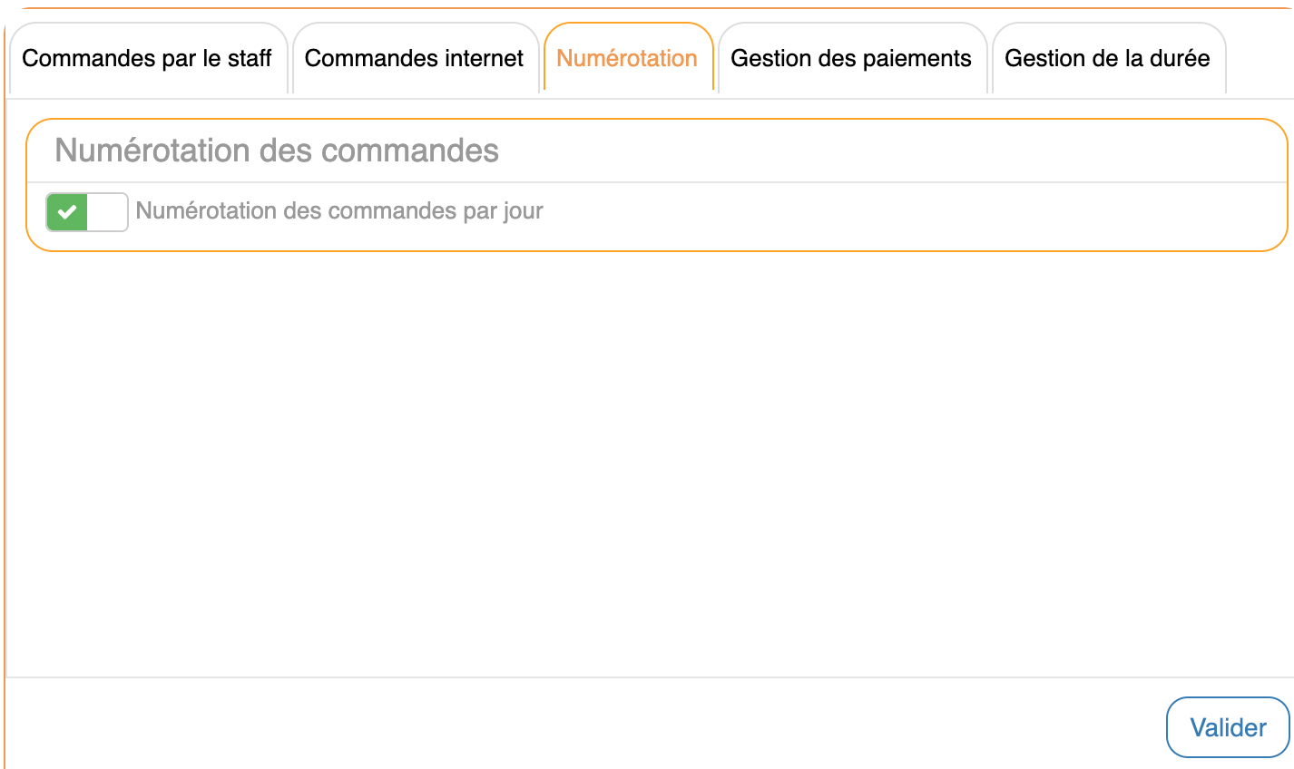 L'onglet Numérotation permet d'activer la numérotation des commandes par jour sur la page Préparation des commandes.