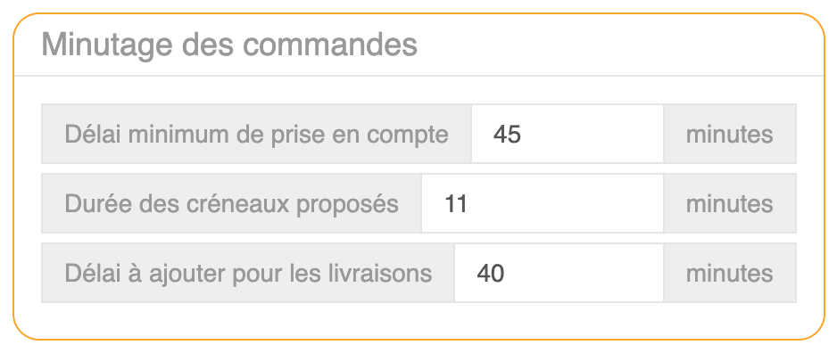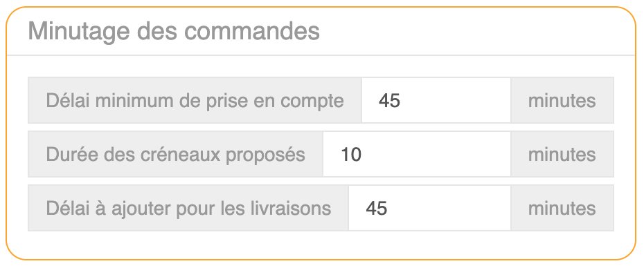 Bloc Minutage des commandes en caisseLe bloc Minutage des commandes permet de définir le délai de prise en compte des commandes, la durée des créneaux proposés ainsi que le temps à ajouter lorsqu'il s'agit d'une commande en livraison.