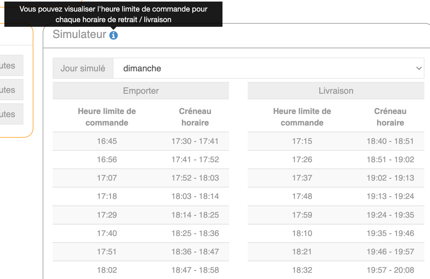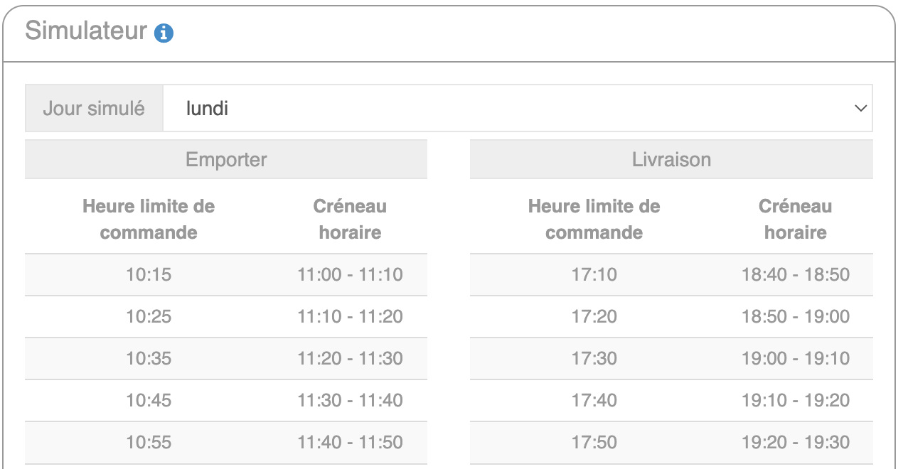 Bloc Simulation des horaires de commandesLe bloc Simulateur permet d'avoir un aperçu des créneaux disponibles en fonction du jour et de l'heure de commande selon les paramètres définis.