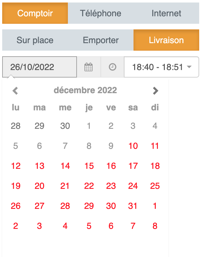 Calendrier de planification des commandes ouvert sur 45 joursCréation des commandes en caisse