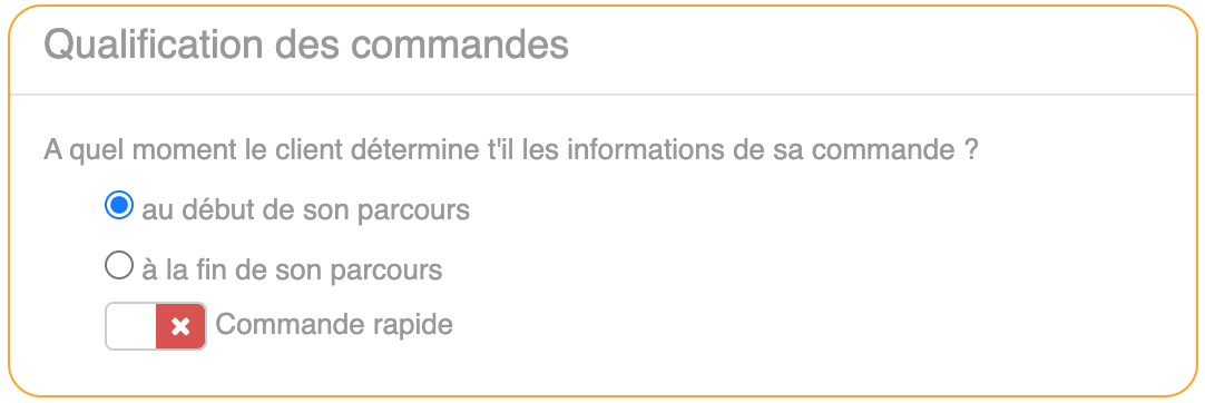 Bloc Qualification des commandesDepuis le site marchand, il est possible d'activer la qualification de commande en début de parcours (quand le client ajoute un premier produit au panier) ou en fin de parcours (quand le client valide son panier).