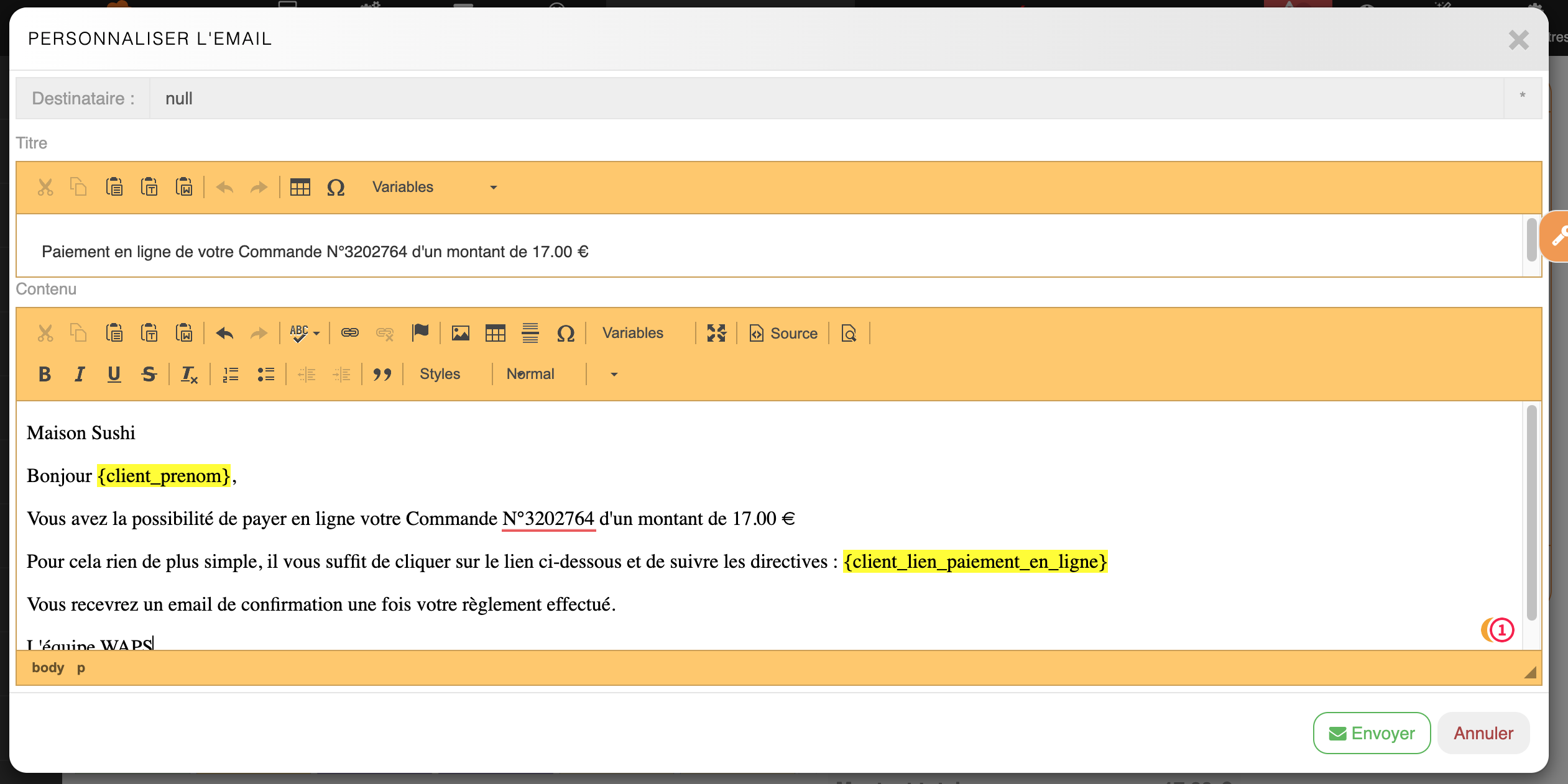L'action Paiement par internet permet d'envoyer un mail au client afin qu'il puisse payer directement en ligne. Pour ce faire, il faut penser à créer un compte au client avec une adresse mail valide et à l'associer à la commande.