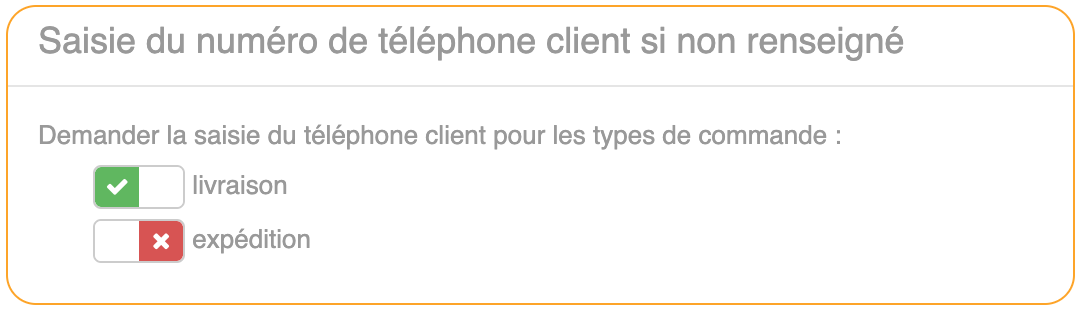 Lorsqu'un client commande en ligne, si son numéro de téléphone n'est pas renseigné, il est possible de lui demander de l'ajouter pour une commande en livraison ou en expédition.