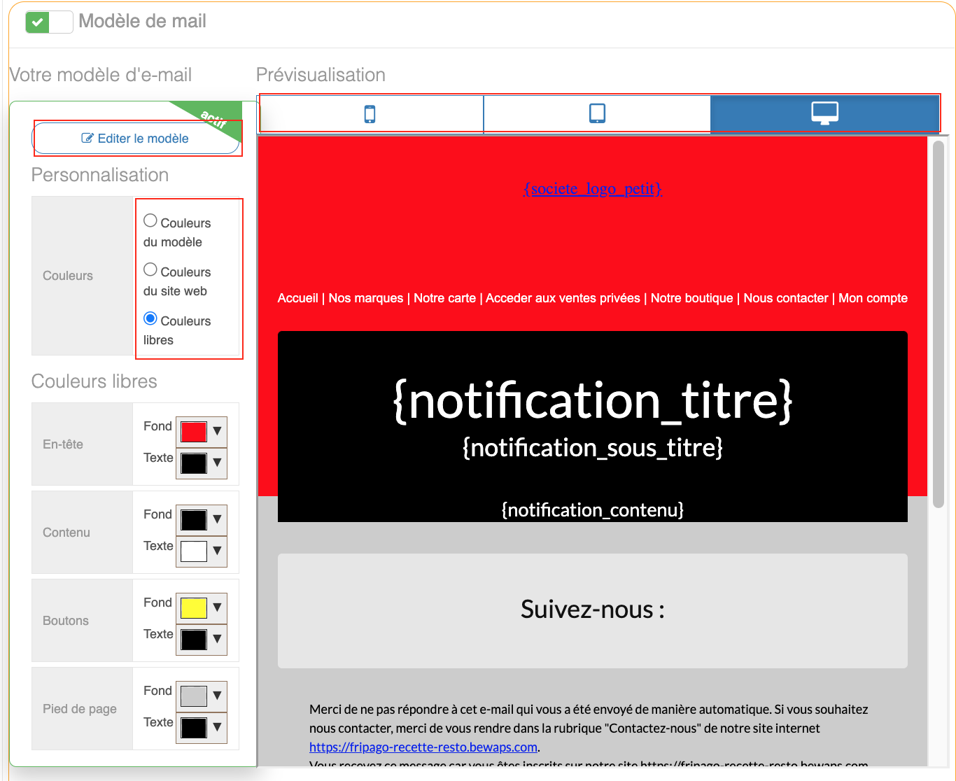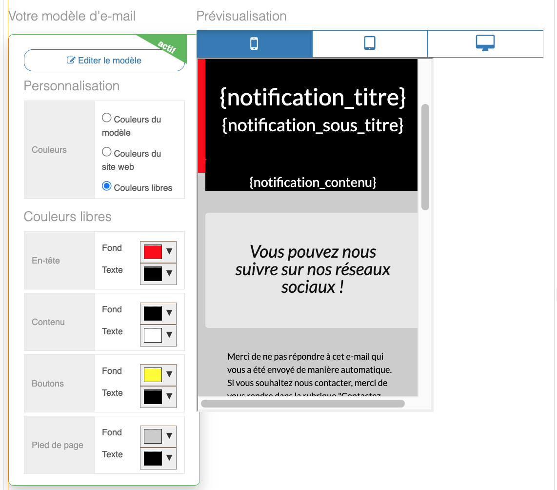 Il est possible d'avoir un aperçu du modèle E-mail selon les appareils utilisés (Ordinateur, Tablette, Smartphone).