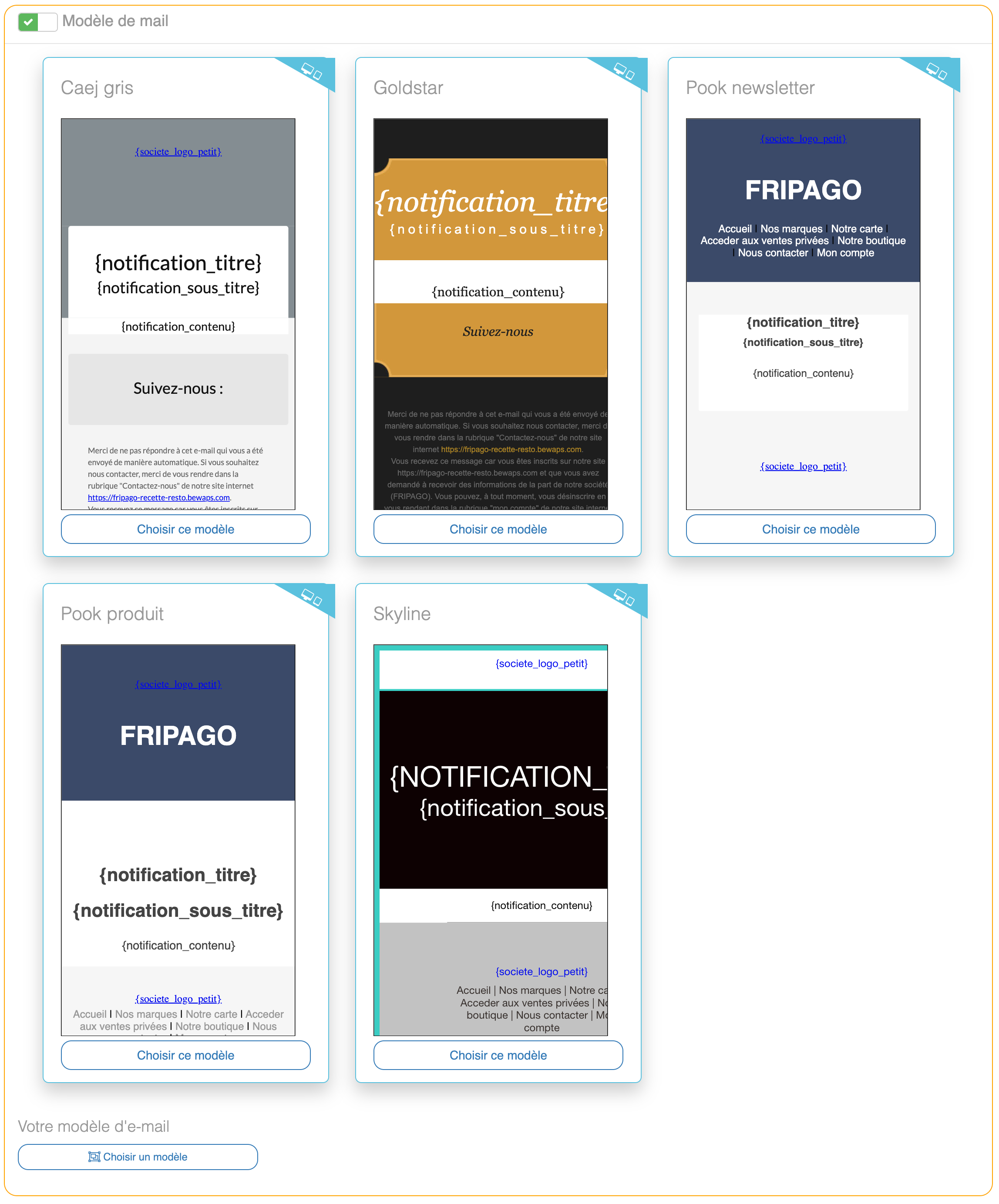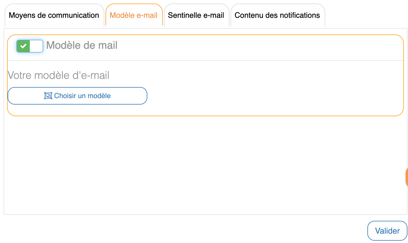 Interface Paramètres - Votre communication - Notifications clientL'onglet « Modèle e-mail » permet d'activer le modèle de mail afin de pouvoir Choisir un modèle.