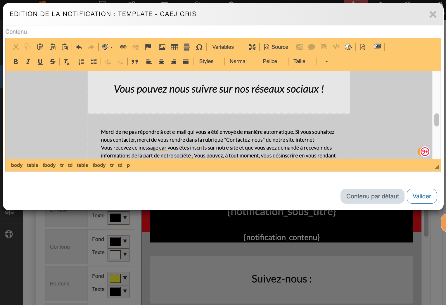Interface Personnalisation du modèle de notification E-mailDepuis la fenêtre d'édition, le restaurateur peut changer le contenu du modèle E-mail. Le bouton Par défaut permet de réinitialiser les changements apportés.