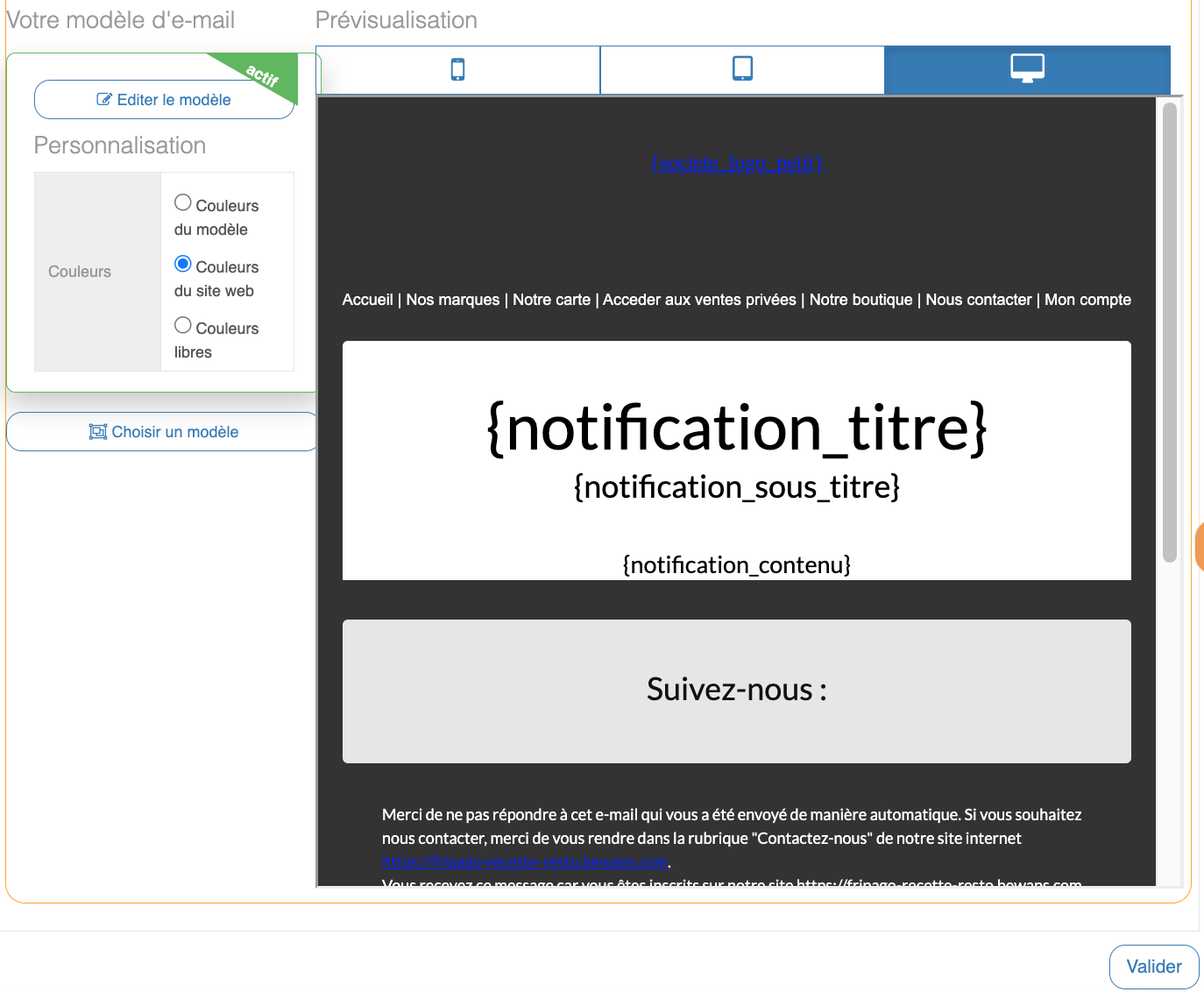 Modèles de mail activéUne fois le modèle choisi, il ne reste plus qu'à cliquer sur Valider. Il est possible de changer de modèle en cliquant sur Choisir un modèle.